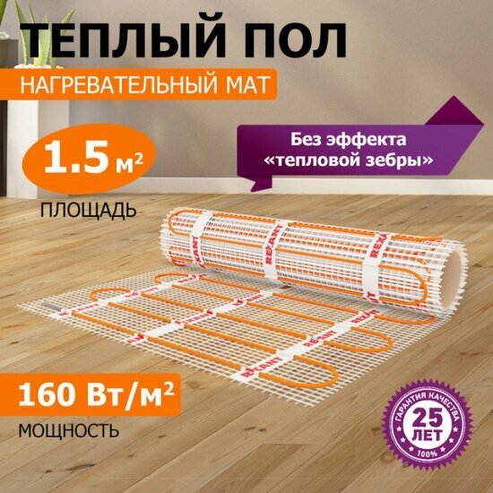 Rexant Теплый пол /нагревательный Мат/, площадь 1,5 м2 /0,5x3,0 метра/, 240Вт, /двух жильный/ 51-050 .
