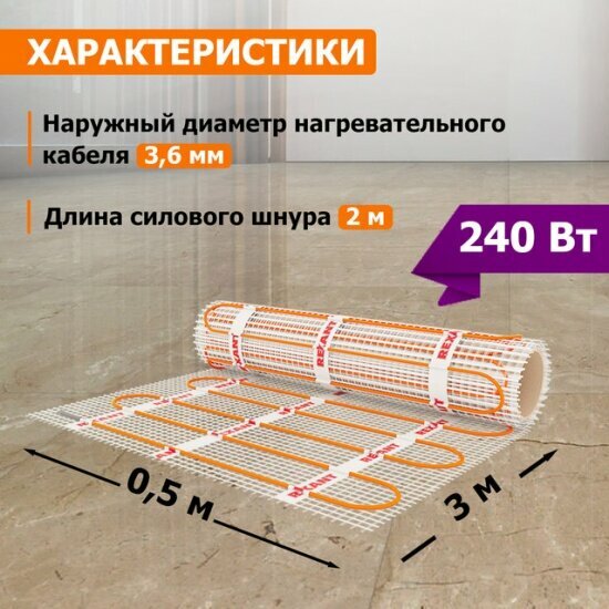 Rexant 51-0503 Теплый пол (нагревательный Мат) Extra, площадь 1,5 м2 (0,5 х 3,0 метра), 240Вт, (двух .