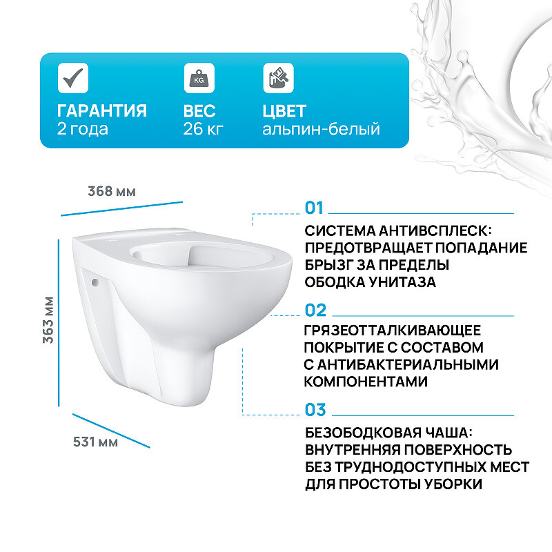 Подвесной унитаз Grohe Bau Ceramic 36,8х53,1см, арт. 39427000, безободковый, без сиденья