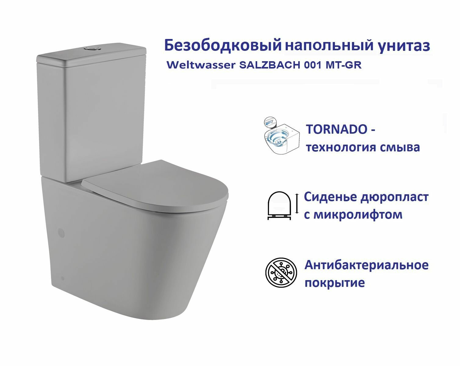 Унитаз WeltWasser WW SALZBACH 001MT-GR безободковый, с сиденьем микролифт, серый матовый
