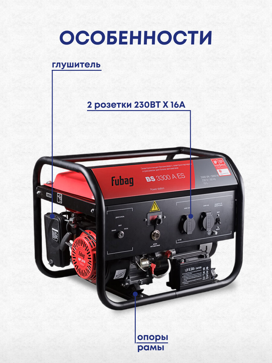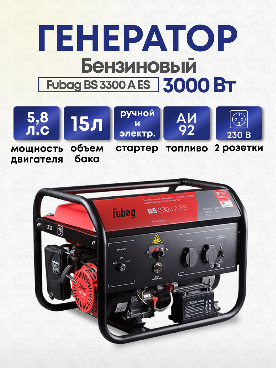Ниже Вы можете прочитать отзывы на Бензиновый генератор Fubag BS 3300 A ES, ознакомится с подробными характеристиками, посмотреть интересные обзоры и фотографии на Бензиновый генератор Fubag BS 3300 A ES.