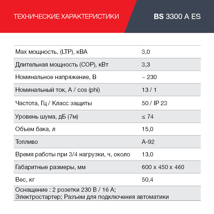 | Дополнительная информация | Максимальную мощность генератора 3300 Вт |