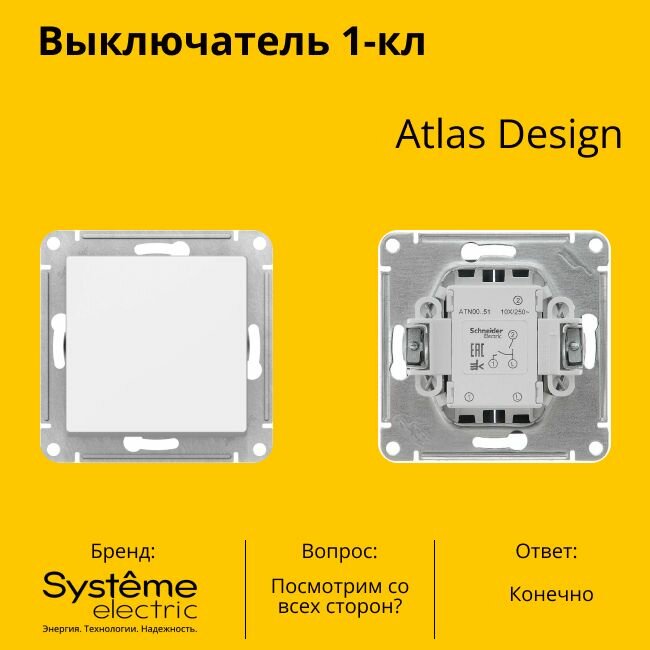 Выключатель Systeme Electric / Систем Электрик AtlasDesign, 10АХ схема 1, белый одноклавишный, ATN000111 / переключатель