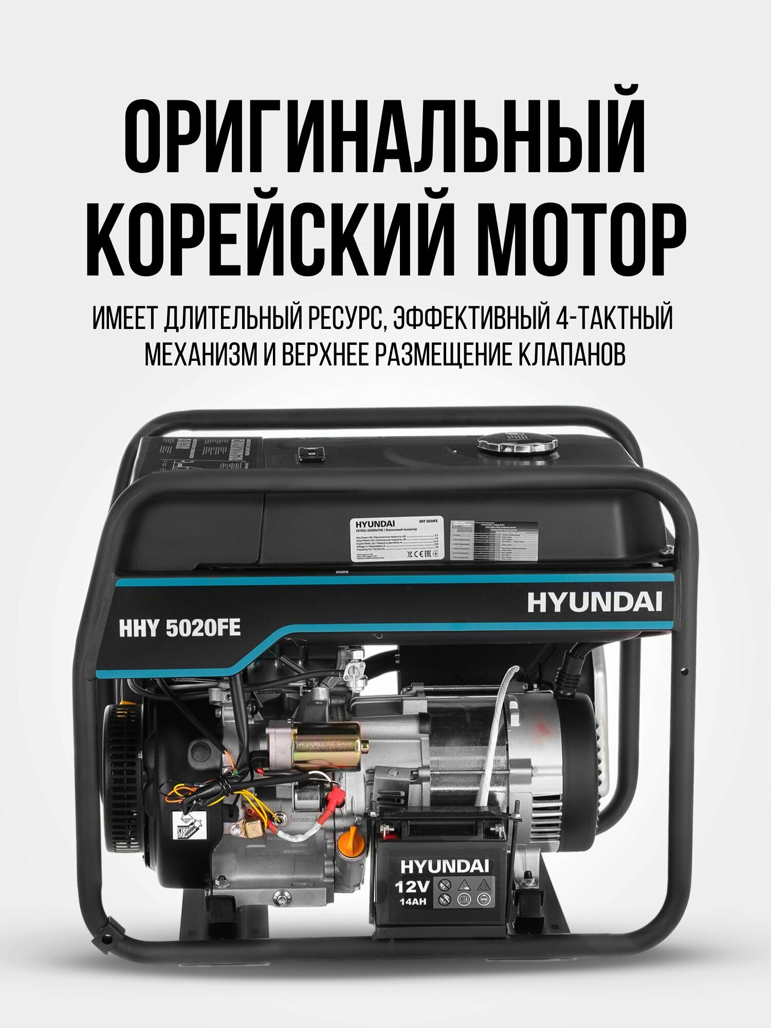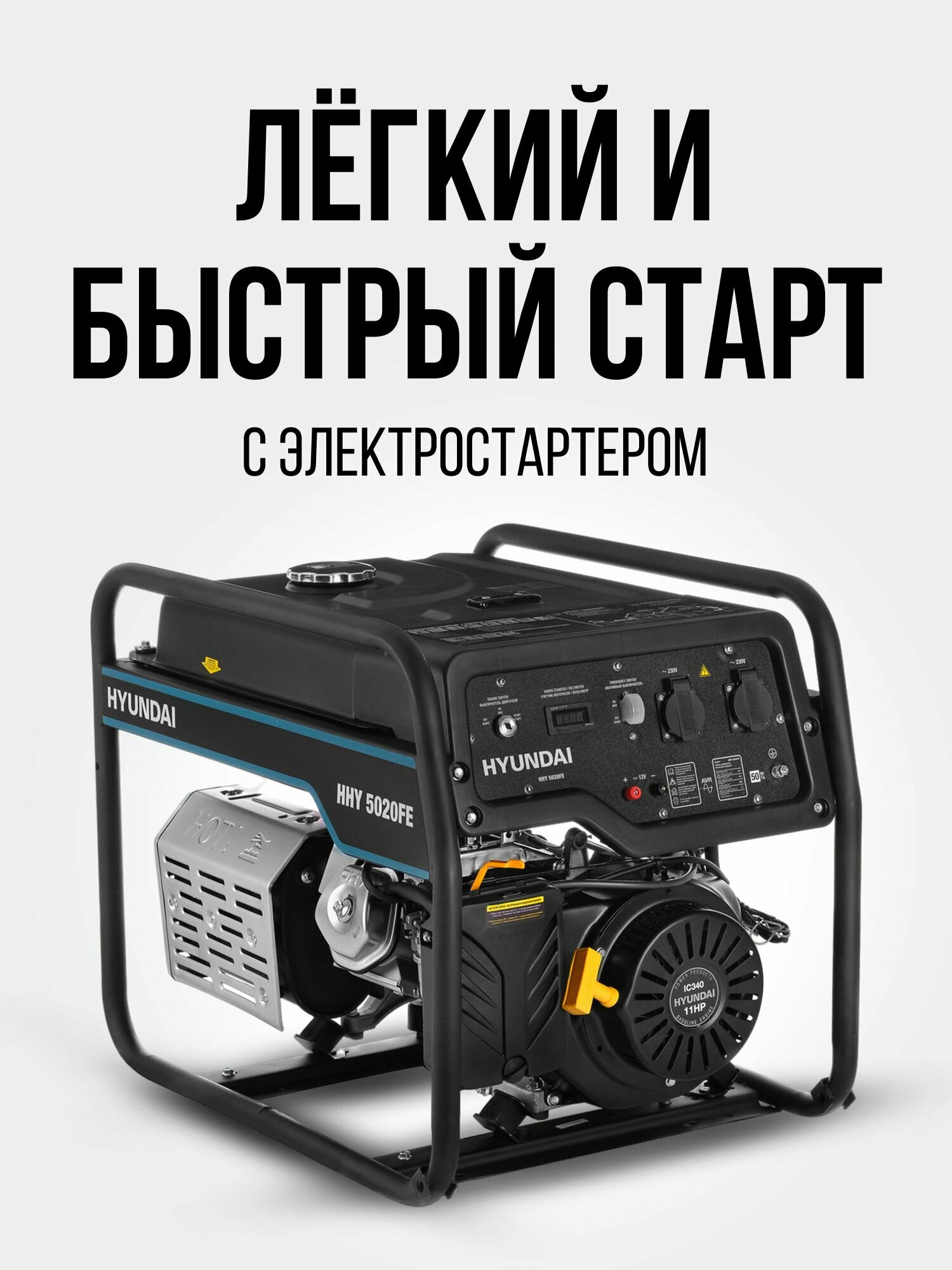 HYUNDAI [HHY 5020FE] Генератор бензиновый { Запуск ручной/электро, HYUNDAI IC340, 4-х такт, 11 л.с., 340 см3, 230В/50Гц, 4,5 кВт/nom 4,0кВт, Вес 76,5 кг }