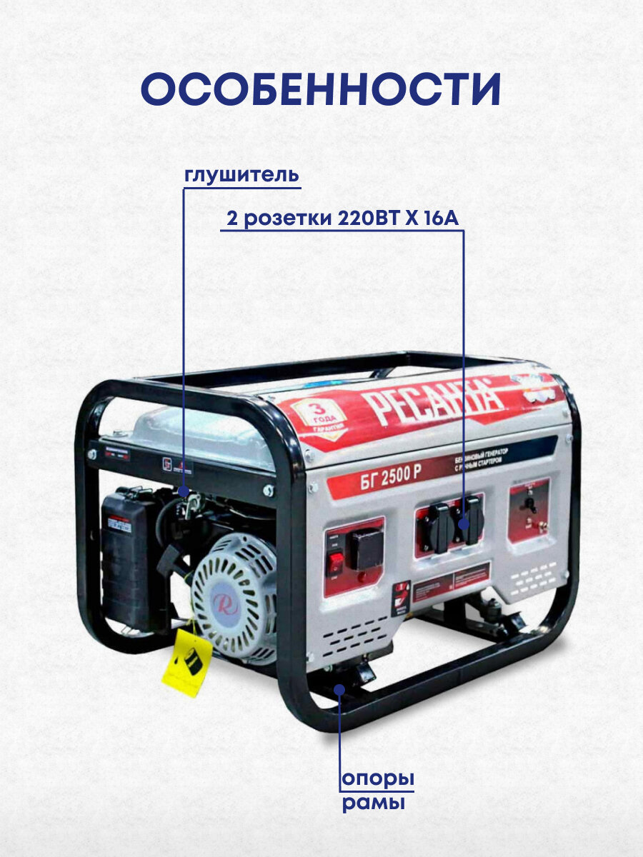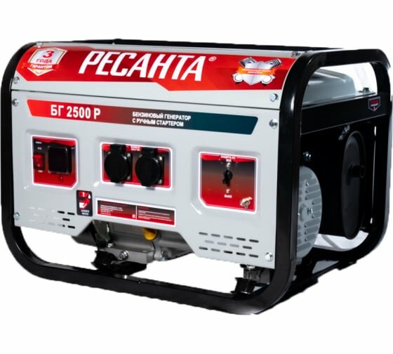 Генератор бензиновый БГ 2500 Р Ресанта с ручным стартером, максимальная мощность 2200 Вт