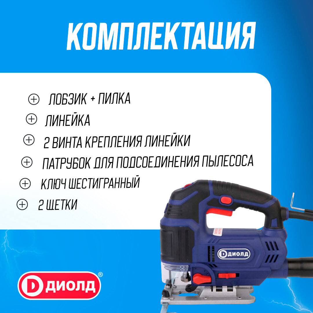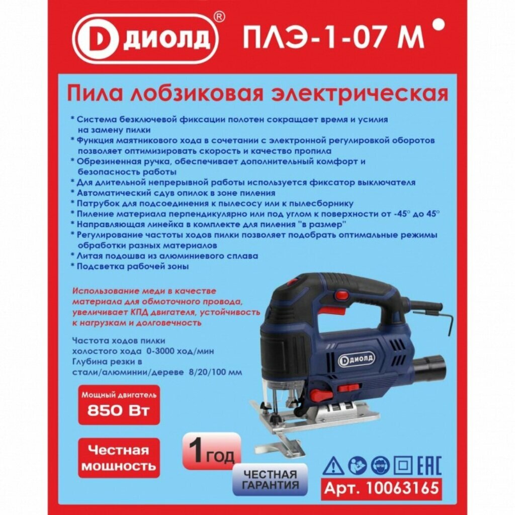 Лобзик электрический диолд ПЛЭ-1-07 М (быстрозажимной механизм), 850Вт,0-3000ход/мин, маятниковый ход, подключение пылесоса, бесключевой зажим, производитель Россия