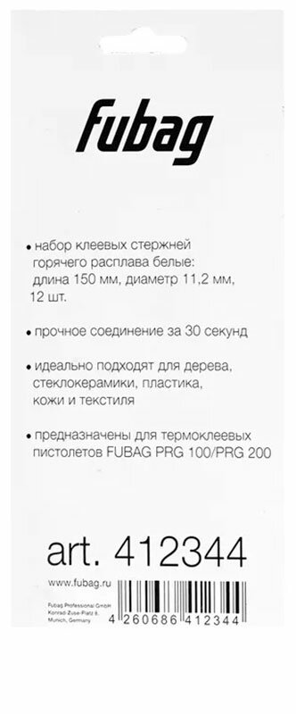 Стержни клеевые 11,2 х 150 мм (12 шт, белые) PRGC 150 FUBAG 412344