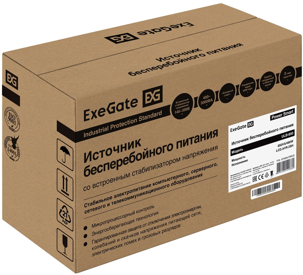 ИБП ExeGate Power Smart Ulb-850.lcd.avr.euro.rj <850va/480w, Lcd, Avr, 2 евророзетки, Rj45/11, Black