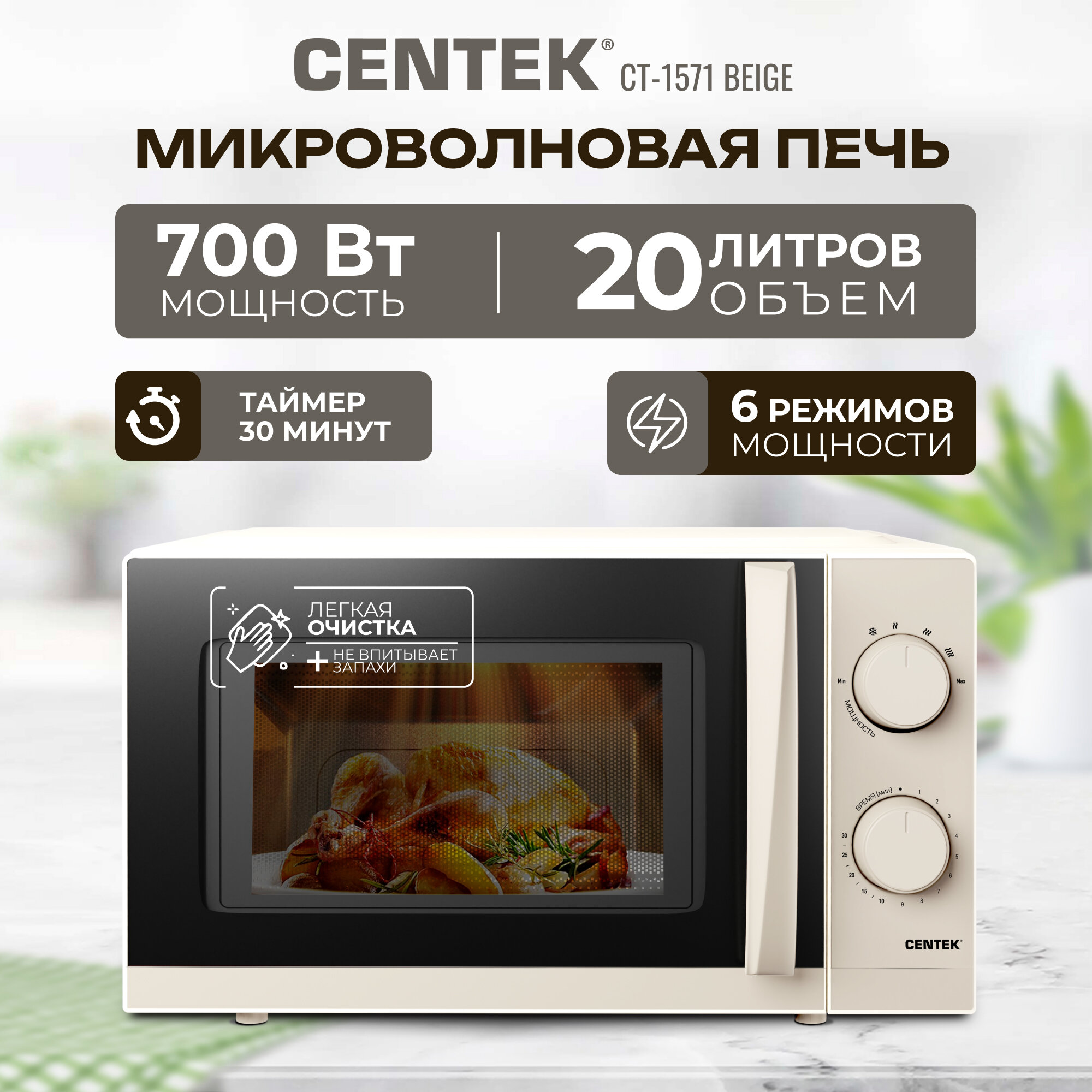 Микроволновая печь CENTEK CT-1571 (Бежевый) 700W <20л> открывание дверцы ручкой, премиальная упаковка,таймер 30 мин