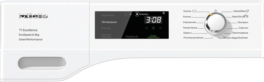| Дополнительная информация | объединение в сеть с системой Miele@home, блокировка ПИН-кодом, индикация «Вылить конденсат», индикация «Очистить фильтр», длина сетевого кабеля: 2 м; тип хладагента: R290, количество хладагента: 0,14 кг, воздействие хладагента на глобальное потепление: 3 CO₂e; опция DryCare 40: высушивает бельё, выстиранное при 40 °C; функция AddLoad: можно легко добавить или вынуть бельё даже после запуска программы; Wash2Dry: сушильная машина автоматически использует ту же программу, что и стиральная |