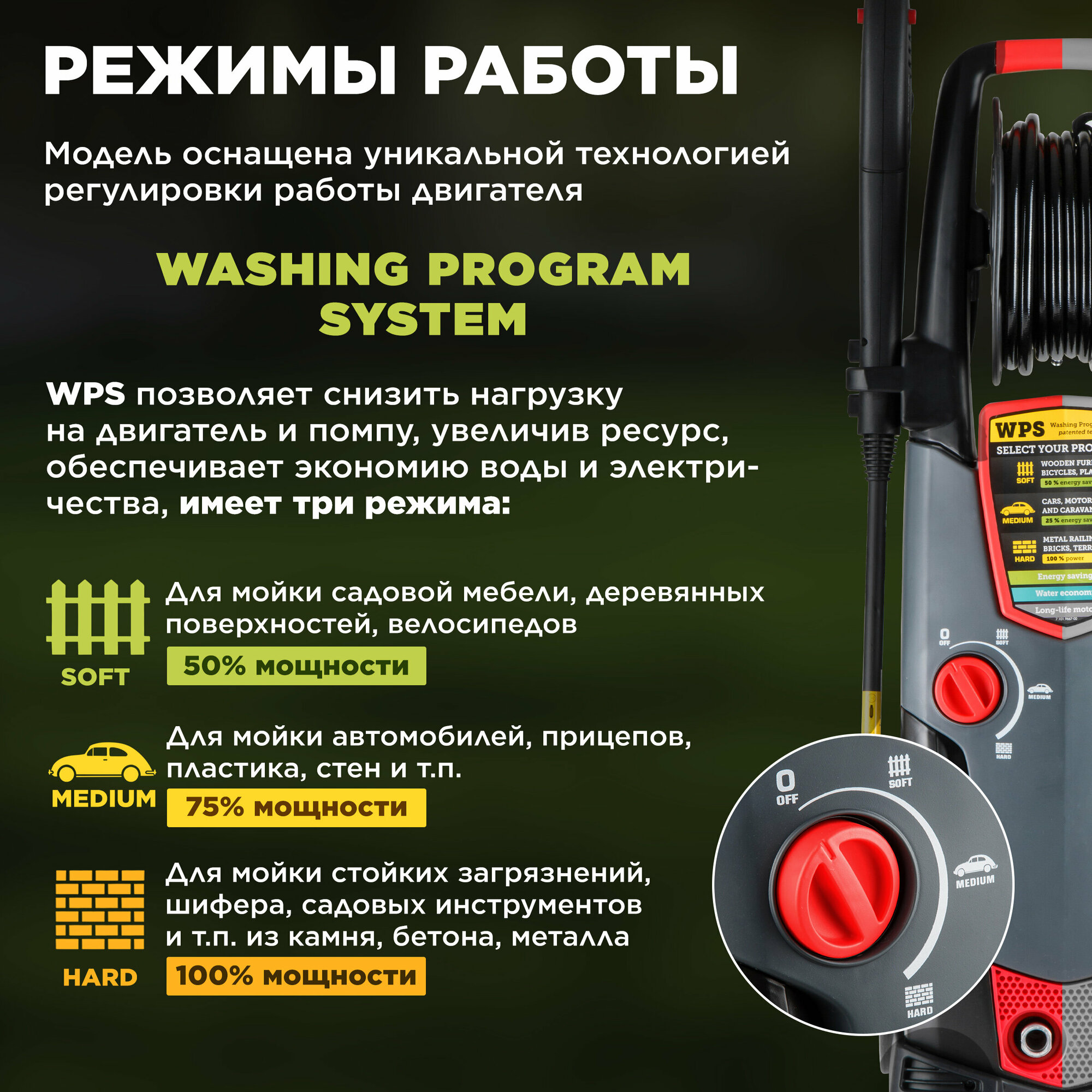 | Плюсы: | Высокие показатели давления и производительности для своей ценовой категории. Три рабочие программы для разных поверхностей, софт – для деревянных, хард – для стен и тротуаров, садового инвентаря, крыши отлично подходит. Грязевая фреза в комплекте. Длинный шланг 8 м – удобно мыть те же стены и тротуары, или минивэн по периметру, например. |