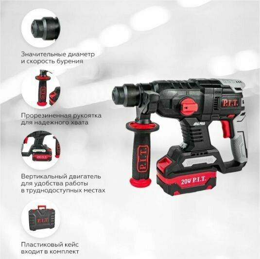 Аккум. перфоратор бесщеточный P.I.T. PBH20H-22A/1 (аккумулятор 4Ач, зарядное устройство,1,5Дж,2-х реж, бур 24мм, sds-plus, кейс)