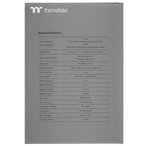 Кулер Thermaltake TOUGHAIR 310 (Intel LGA 1700/1200/1156/1155/1151/1150 AMD AM5/AM4/AM3+/AM3/AM2+/AM2/FM2/FM1, 170W, 123.6x71.7x159.5mm, 23.6 dBA, 12VDC, 5,76W, 500~2000RPM, 4Pin (PWM)) Ret (CL-P074-AL12BL-A)