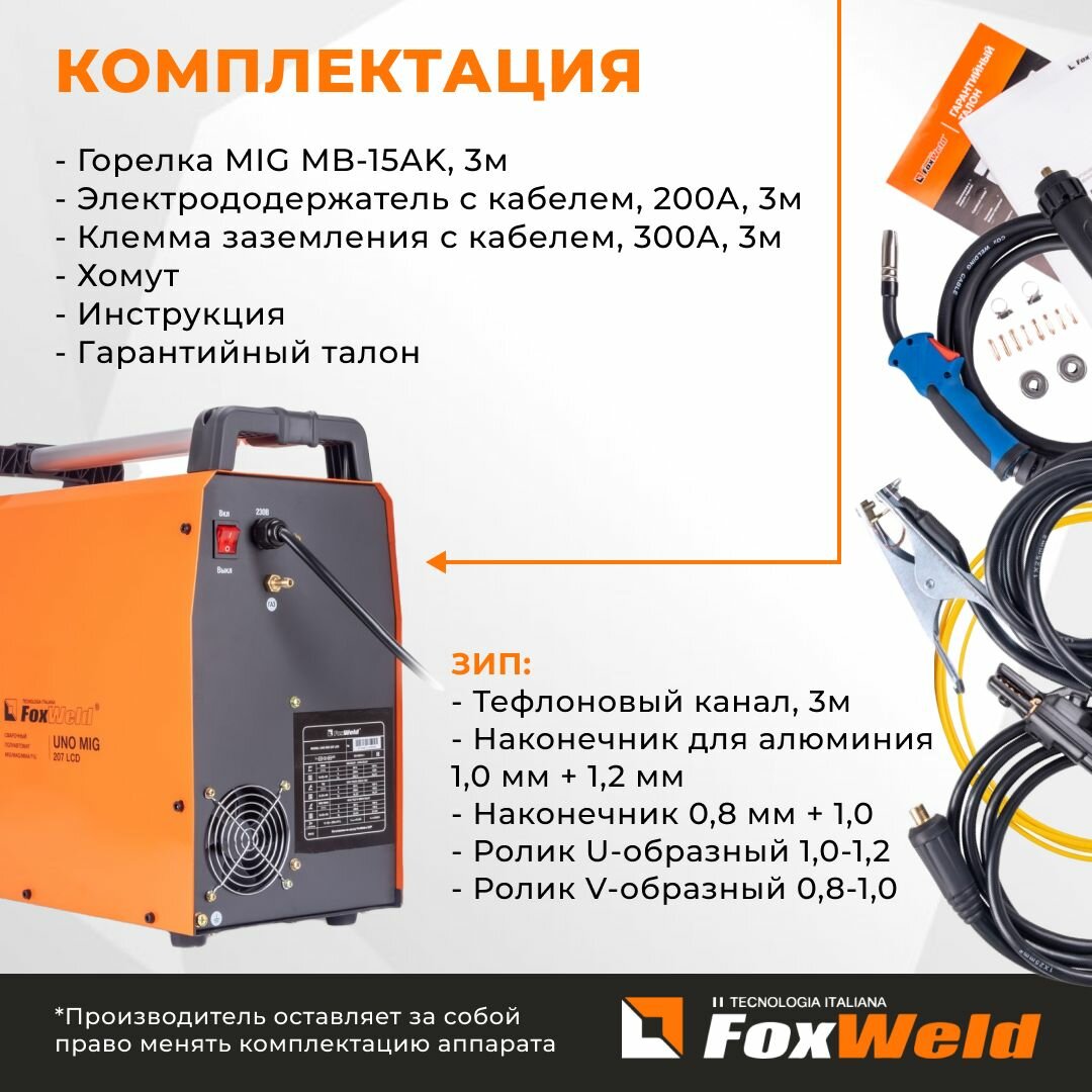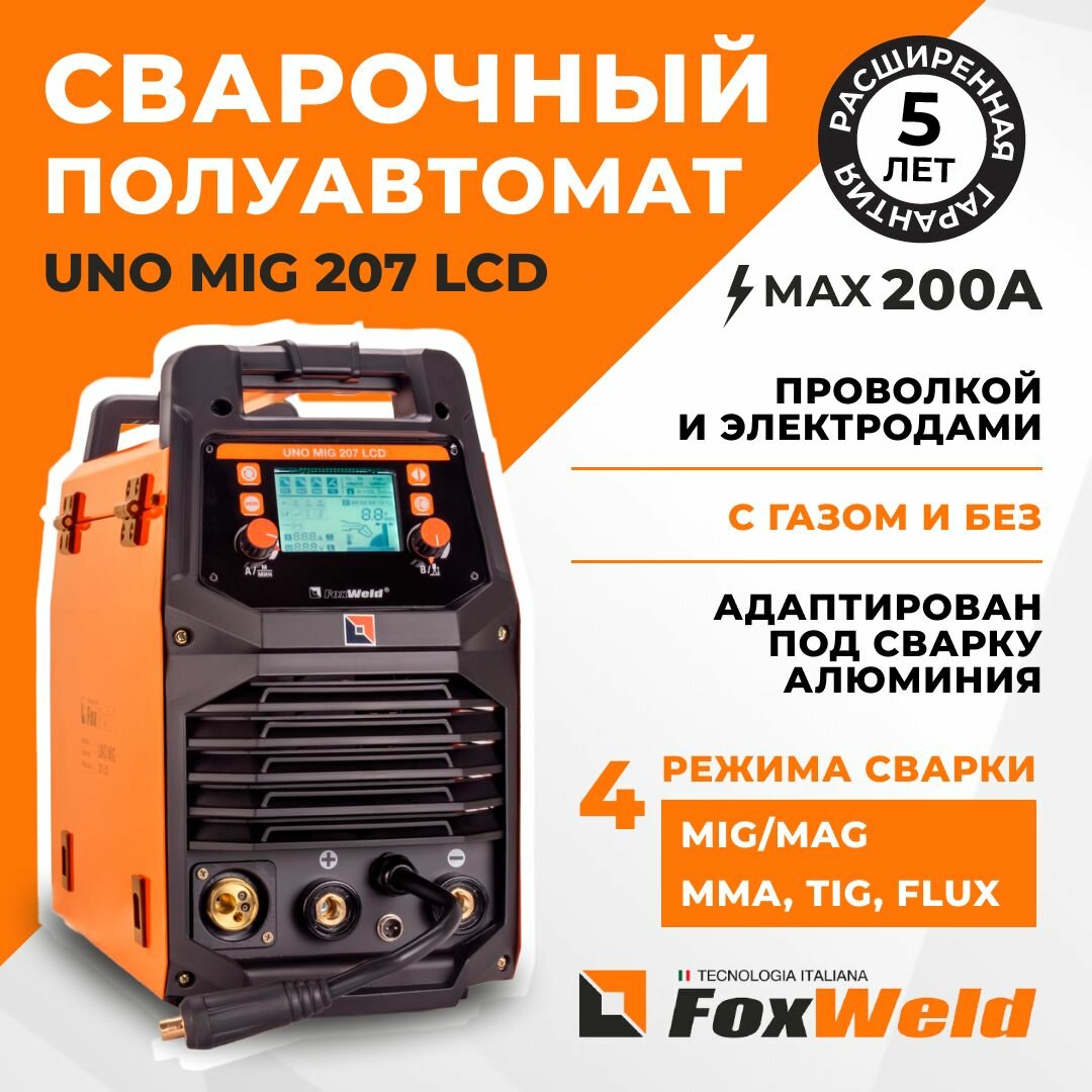 Foxweld Сварочный полуавтомат UNO MIG 207 LCD полуавтоматический инверторный mig mag, сварка без газа, с газом, горячий старт, форсаж дуги, антизалипание электрода, LIFT TIG