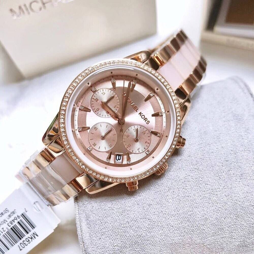 Наручные часы MICHAEL KORS MK6307 женские, кварцевые, хронограф, секундомер, водонепроницаемые, розовый, золотой