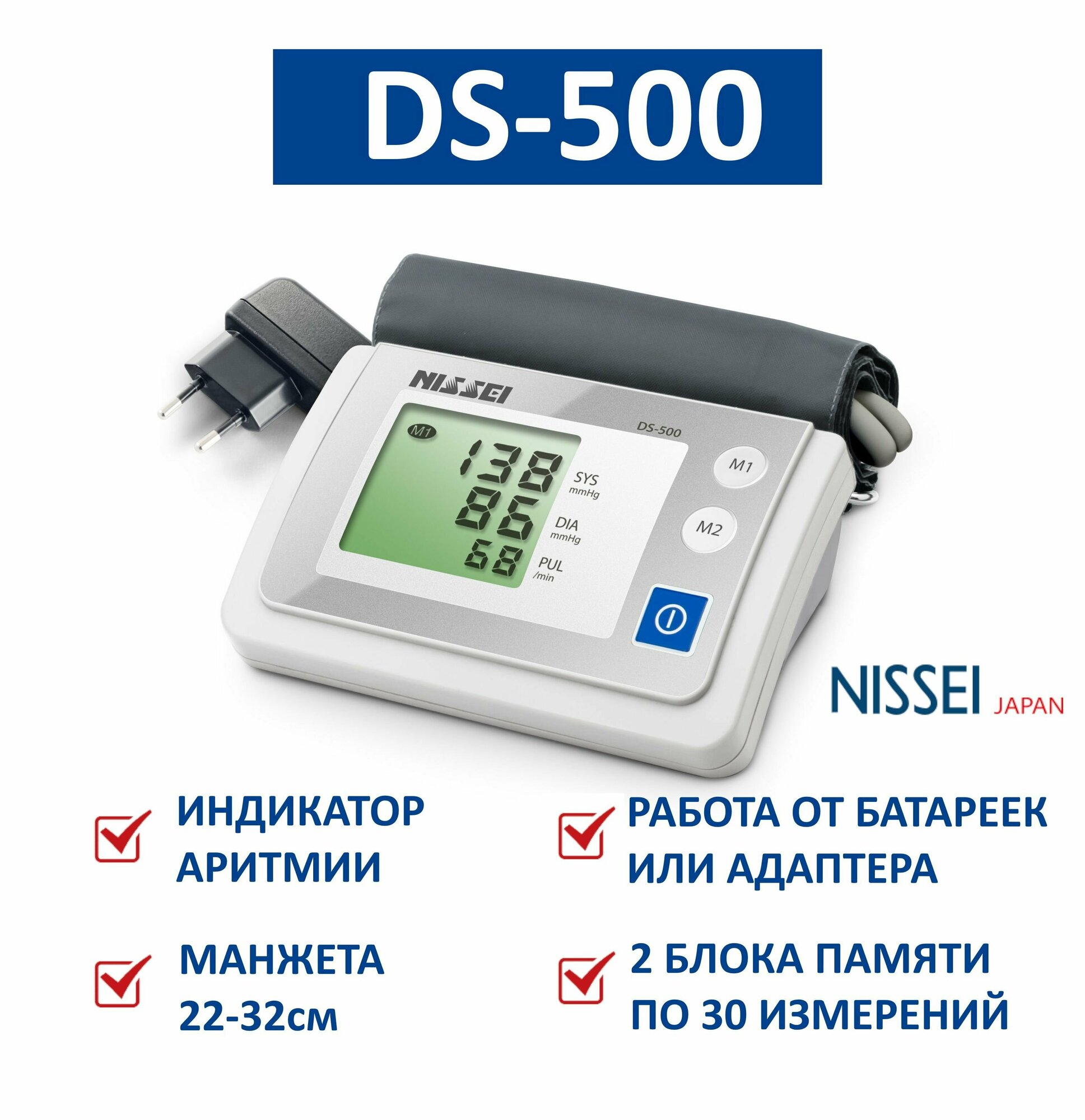 Купить Тонометр NISSEI DS-500 автоматический (манжета 22-32 см, индикатор аритмии, 2 блока памяти по 30 измерений)