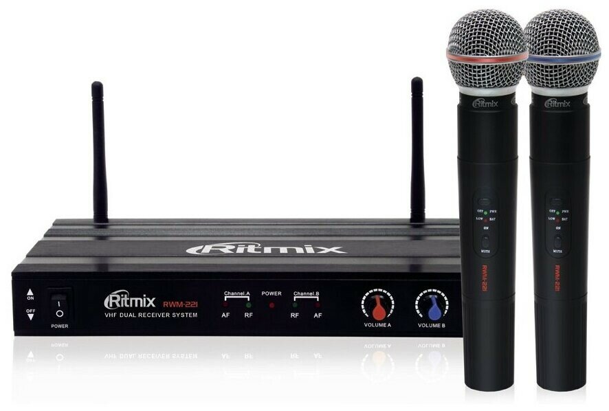 Купить Вокальная радиосистема Ritmix RWM-221, два беспроводных микрофона, отдельные регуляторы, приём 60 метров, черные