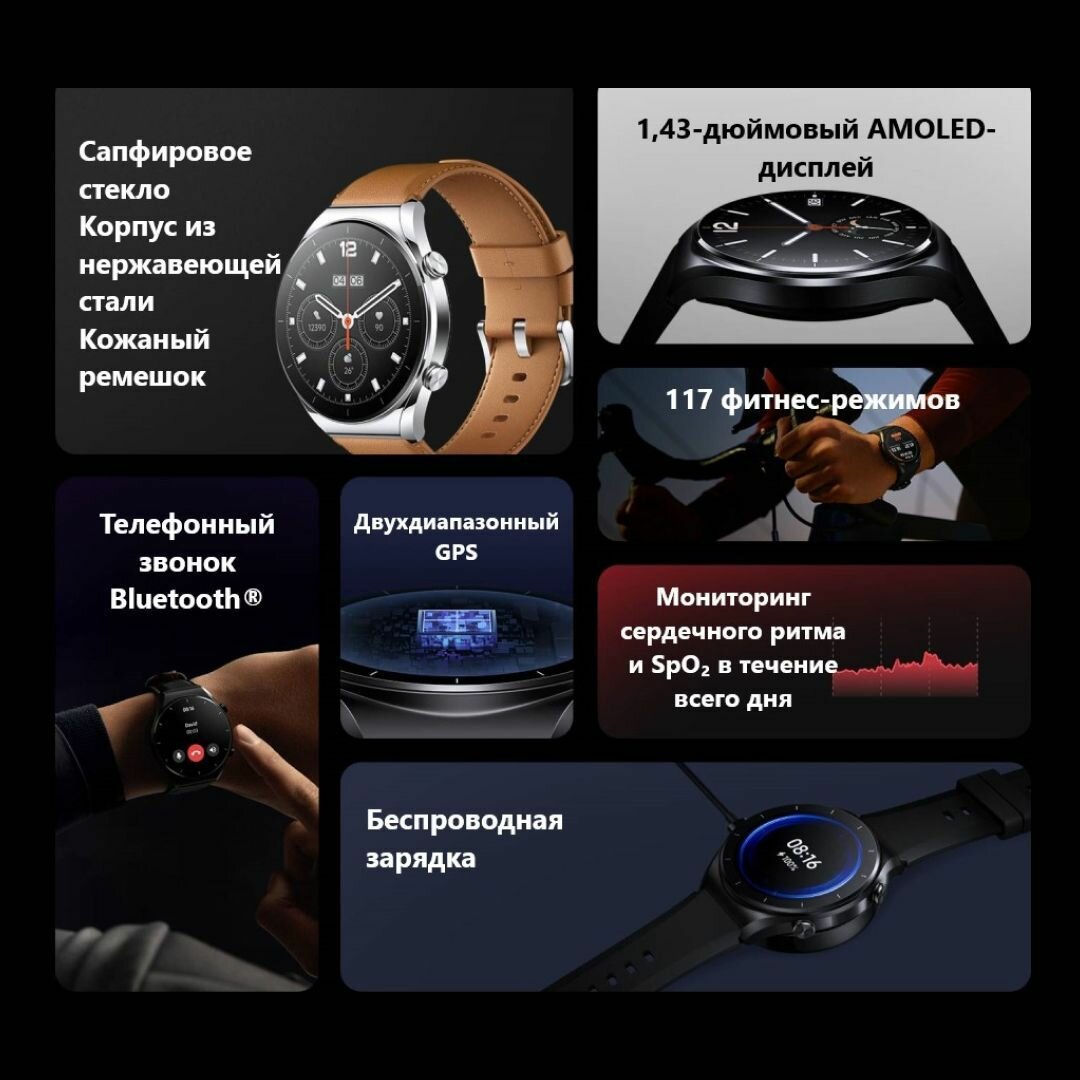 Умные часы Xiaomi Watch S1 Wi-Fi Global для РФ, Black/Black leather strap + black fluoroplast strap