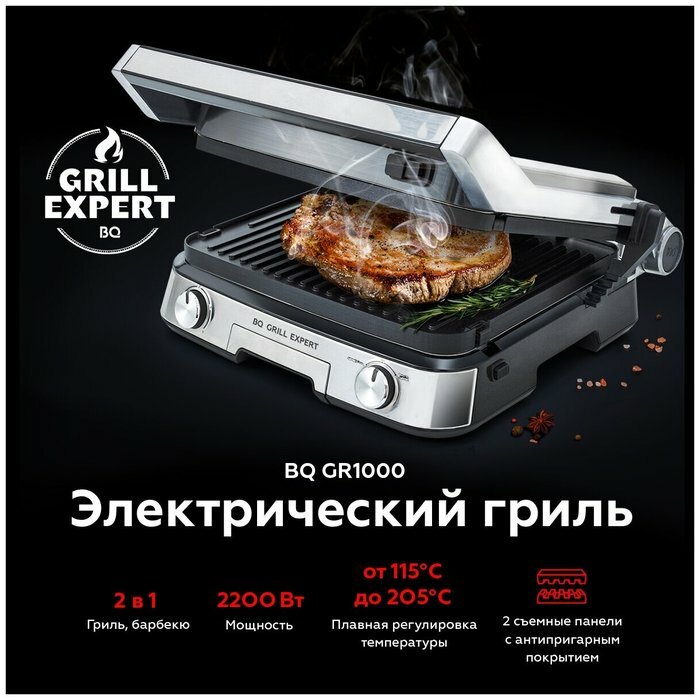 Гриль BQ GR1000 Серый металлик (2200 Вт, съемные пластины)