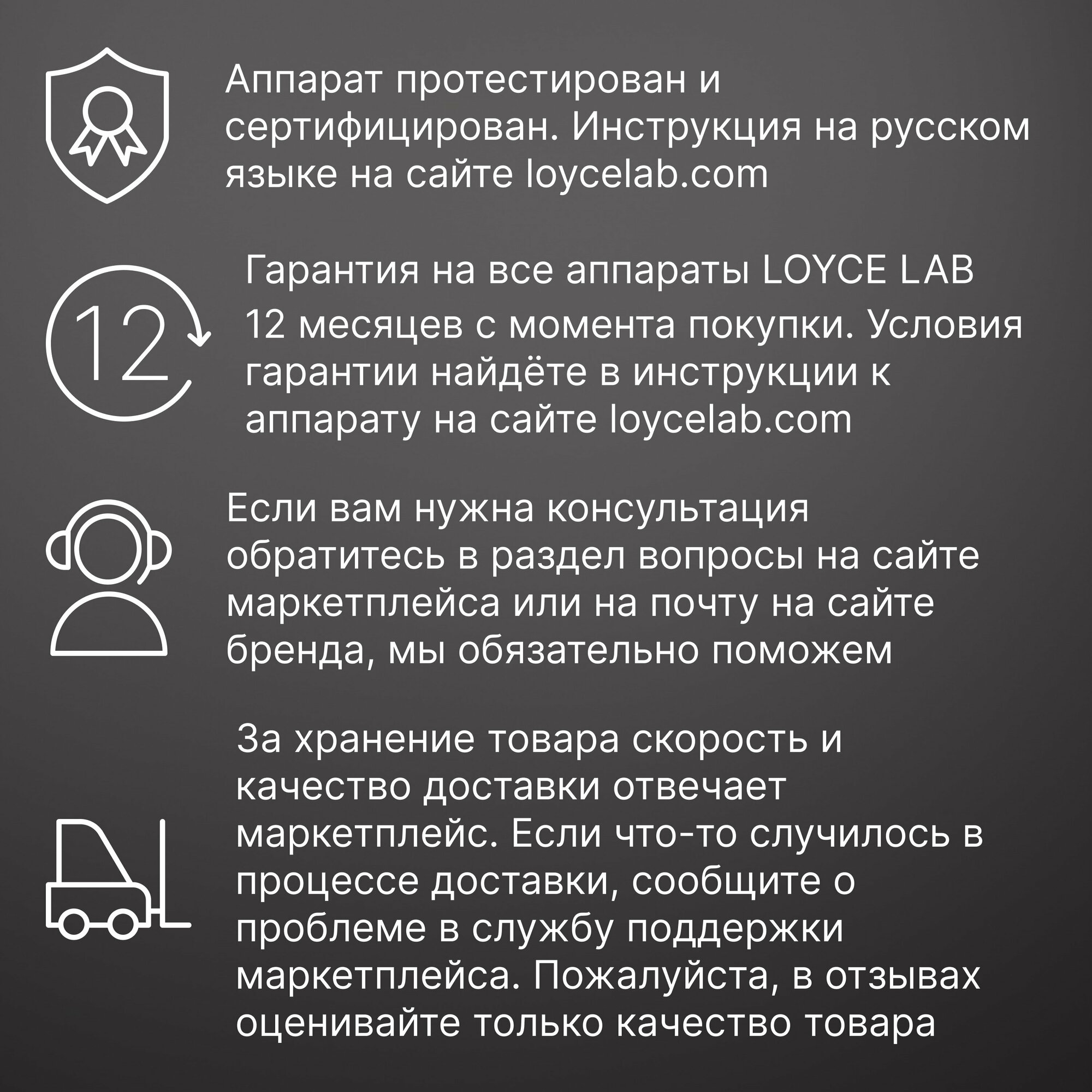 | Противопоказания | несовершеннолетним лицам; в период беременности, лактации, менструации; в случае болезни сердца, гипертонии, ишемической болезни сердца, диабета, рака кожи или щитовидной железы, злокачественных новообразований; в случае инфекции кожи, ожога кожи, нарушения свертываемости крови, кожных кровотечений или кожных аллергий; не использовать в области хирургического вмешательства; после инъекций ботокса или гиалуроновой кислоты аппарат можно использовать через три месяца; после процедуры имплантации золотых нитей через шесть месяцев; не использовать при экземе или других острых или хронических заболеваниях кожи; запрещено использовать аппарат людям с кардиостимулятором или другим электронным устройством в теле |