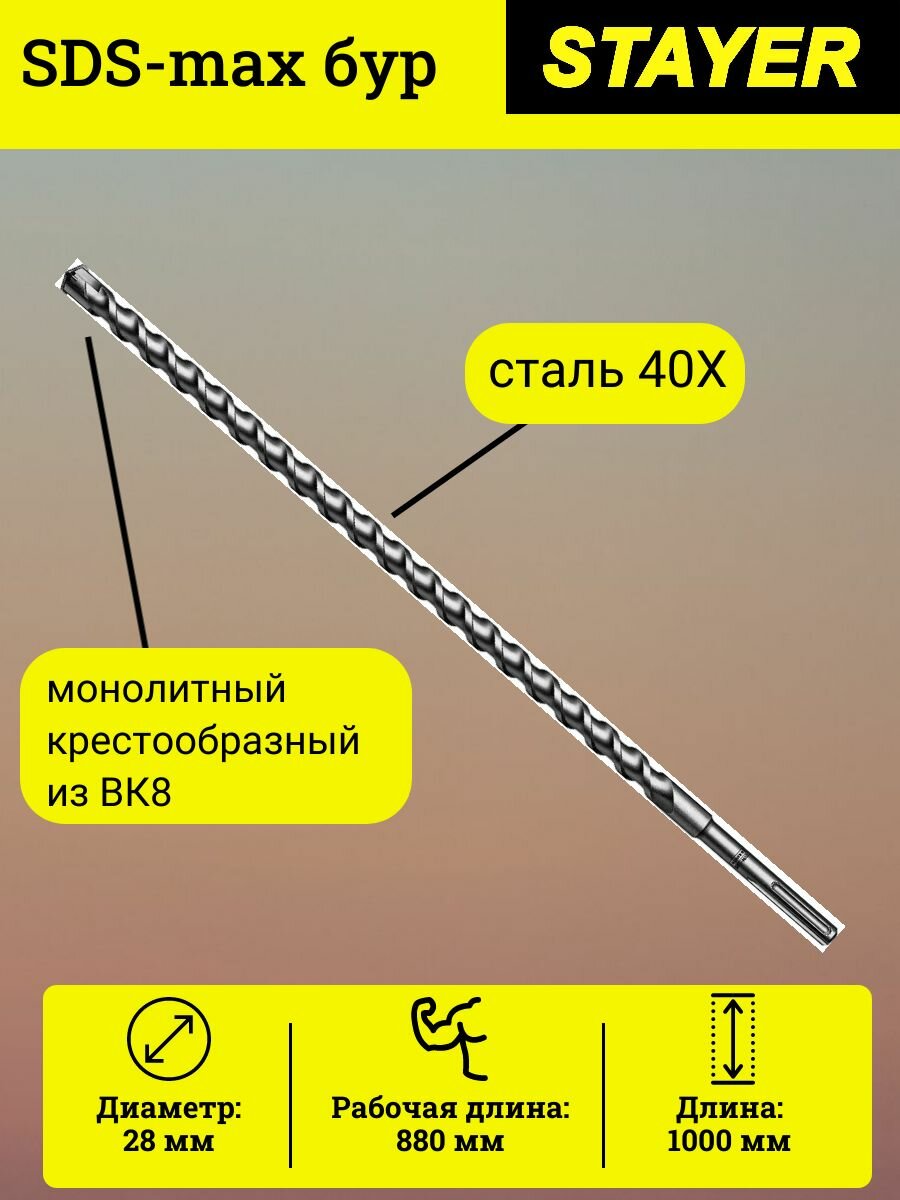 STAYER Бур SDS-max 28 x 880/1000 мм(29370-880-28)