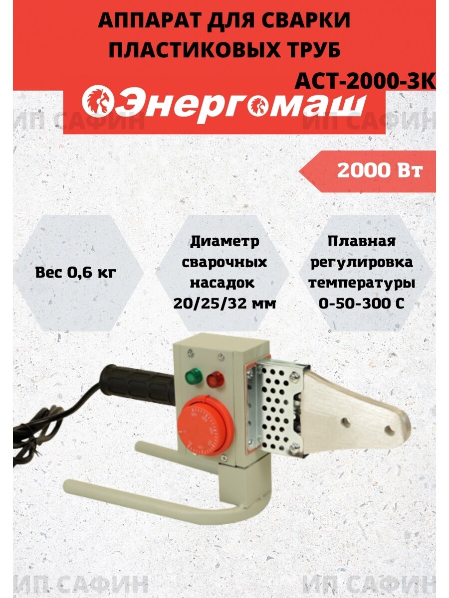 Аппарат для сварки пластиковых труб Энергомаш АСТ-2000-3К, 2000Bт, 3 насадки 20-25-32мм, 1 шт