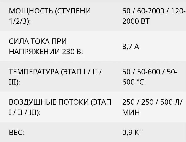| Дополнительная информация | 3 режима работы - 50 °C, 250 л/мин; 50-600 °C, 250 л/мин; 50-600 °C, 500 л/мин; возможность стационарного использования; мягкая резиновая ручка; скребок |