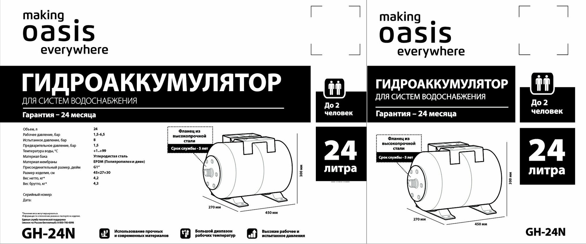 Ниже Вы можете прочитать отзывы на Гидроаккумулятор Oasis GH-24N, для систем водоснабжения, горизонтальный, 24 л 1342105, ознакомится с подробными характеристиками, посмотреть интересные обзоры и фотографии на Гидроаккумулятор Oasis GH-24N, для систем водоснабжения, горизонтальный, 24 л 1342105.