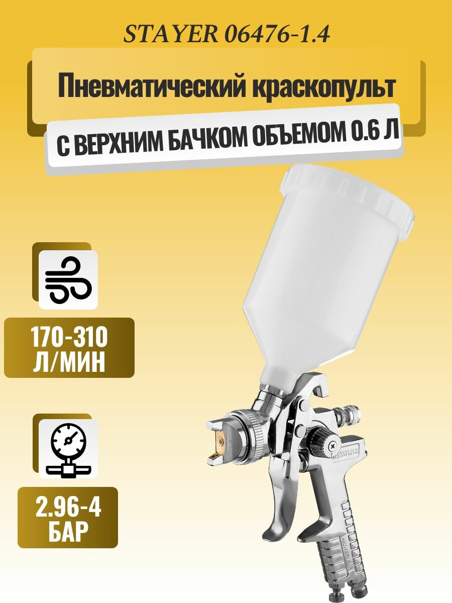 Краскопульт STAYER с верхний бачком -0,6л, сопло 1,4мм, расход воздуха 170-310л/мин AirPro 06476-1.4 (1шт) (06476-1.4)