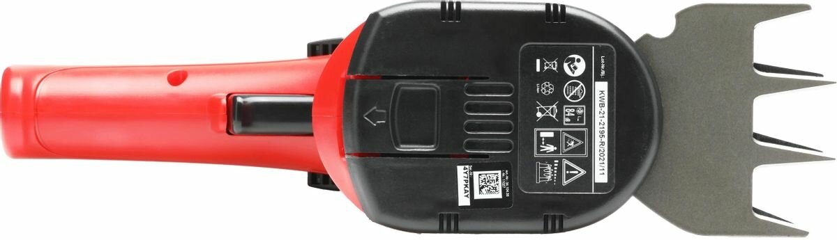| Дополнительная информация | комплект из двух инструментов - ножницы + кусторез; телескопическая ручка в комплект не входит; продолжительность работы: 60 мин; время зарядки: 3-5 ч; количество ходов: 1900 ход/мин; ширина реза ножом для травы: 70 мм; ширина реза ножом для кустарников: 100 мм; интервал между зубьями ножа для травы: 8 мм; интервал между зубьями ножа для кустарников: 8 мм; размер упаковки: 290 x 83 x 123 мм |