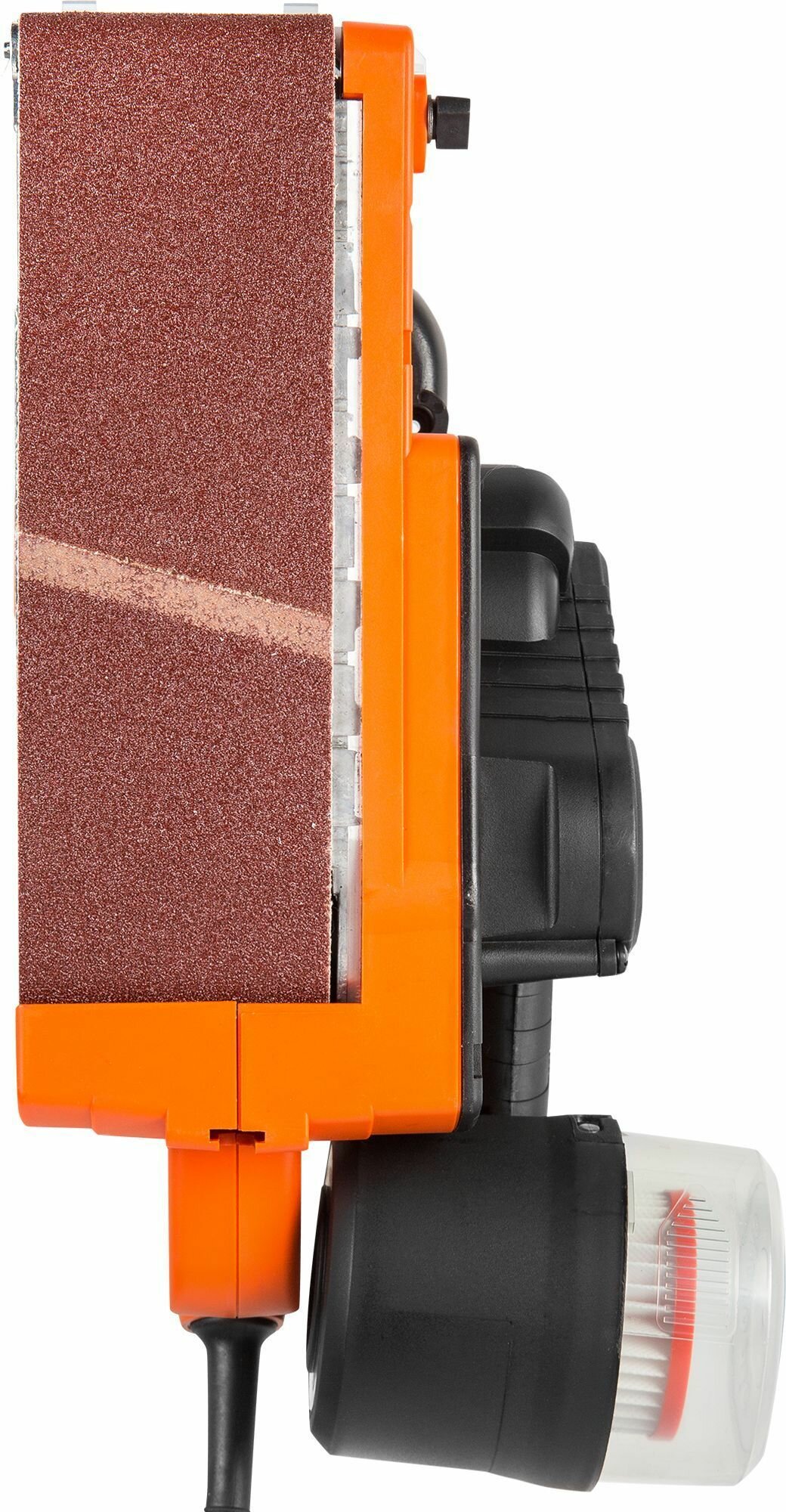 + Большой задний ролик не даёт ленте проскальзывать. + подобная компоновка увеличивает используемую площадь поверхности. + Хорошие материалы, не только пластик и шурупы, но и элементы из литого алюминия. + Неплохой циклонный фильтр, но можно и подключить машину к пылесосу. Разъём для пылесоса стандартный. + можно шлифовать очень близко к стене. |