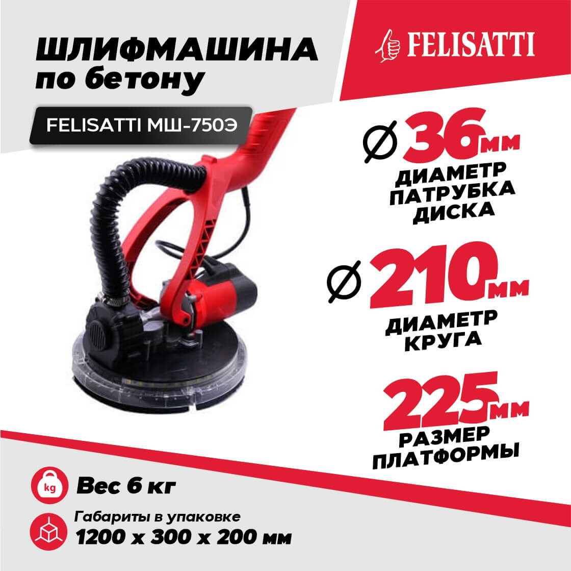 Шлифовальная машина для стен и потолков по бетону FELISATTI МШ-750Э (381.5.1.00) в кейсе