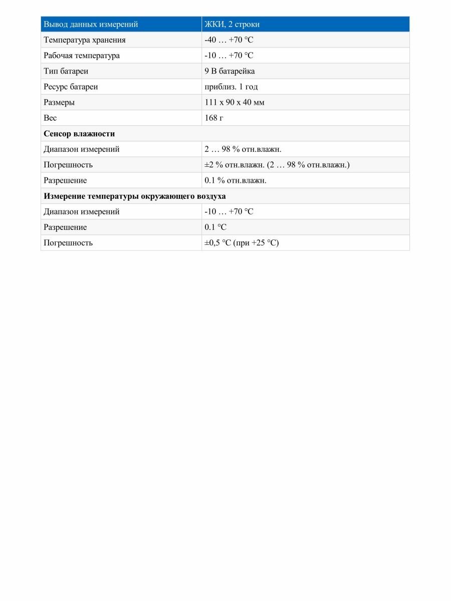 | Минимальная измеряемая влажность (воздух) | 2 % |