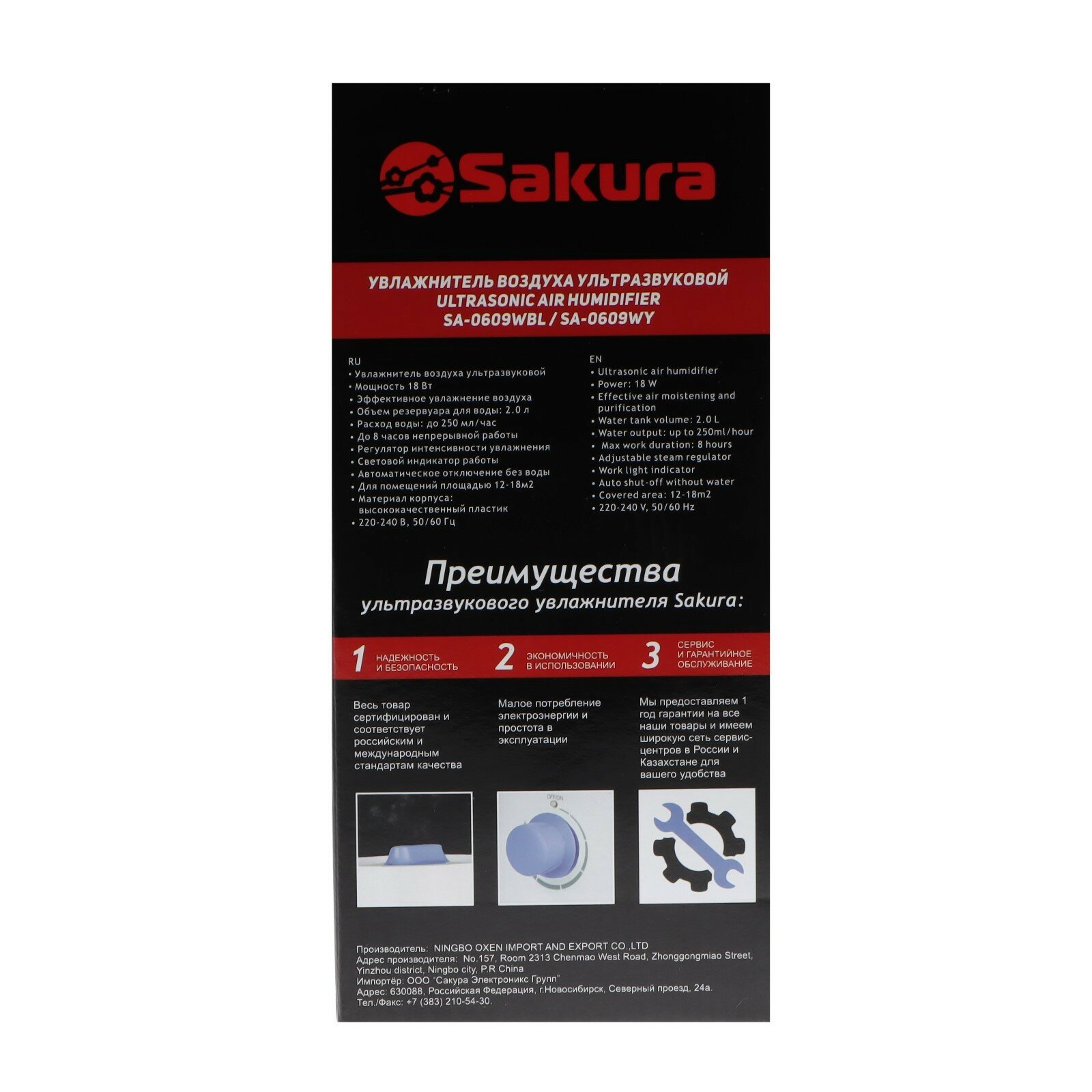Увлажнитель воздуха ультразвуковой Sakura SA-0609WBL, 18 Вт, резервуар 2 литра, расход воды 250 мл/ч, до 8 ч