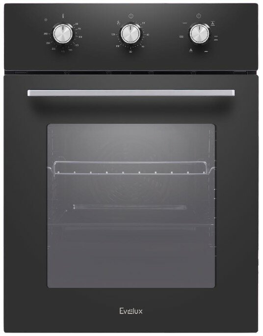 Электрический духовой шкаф Evelux EO 420 PB, черное стекло, 6 режимов работы, эмаль легкой очистки, таймер, защитное отключение, решетка-гриль и универсальный противень в комплекте
