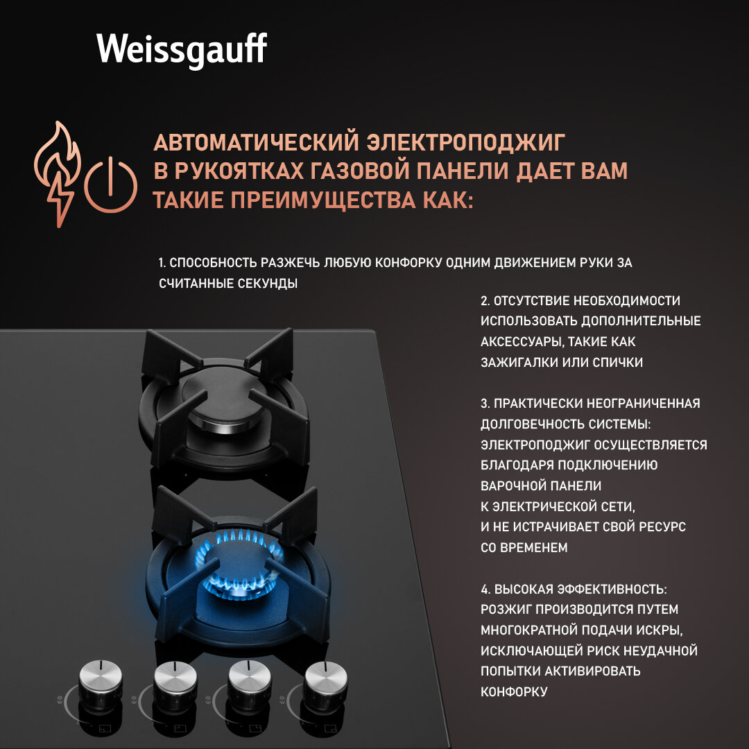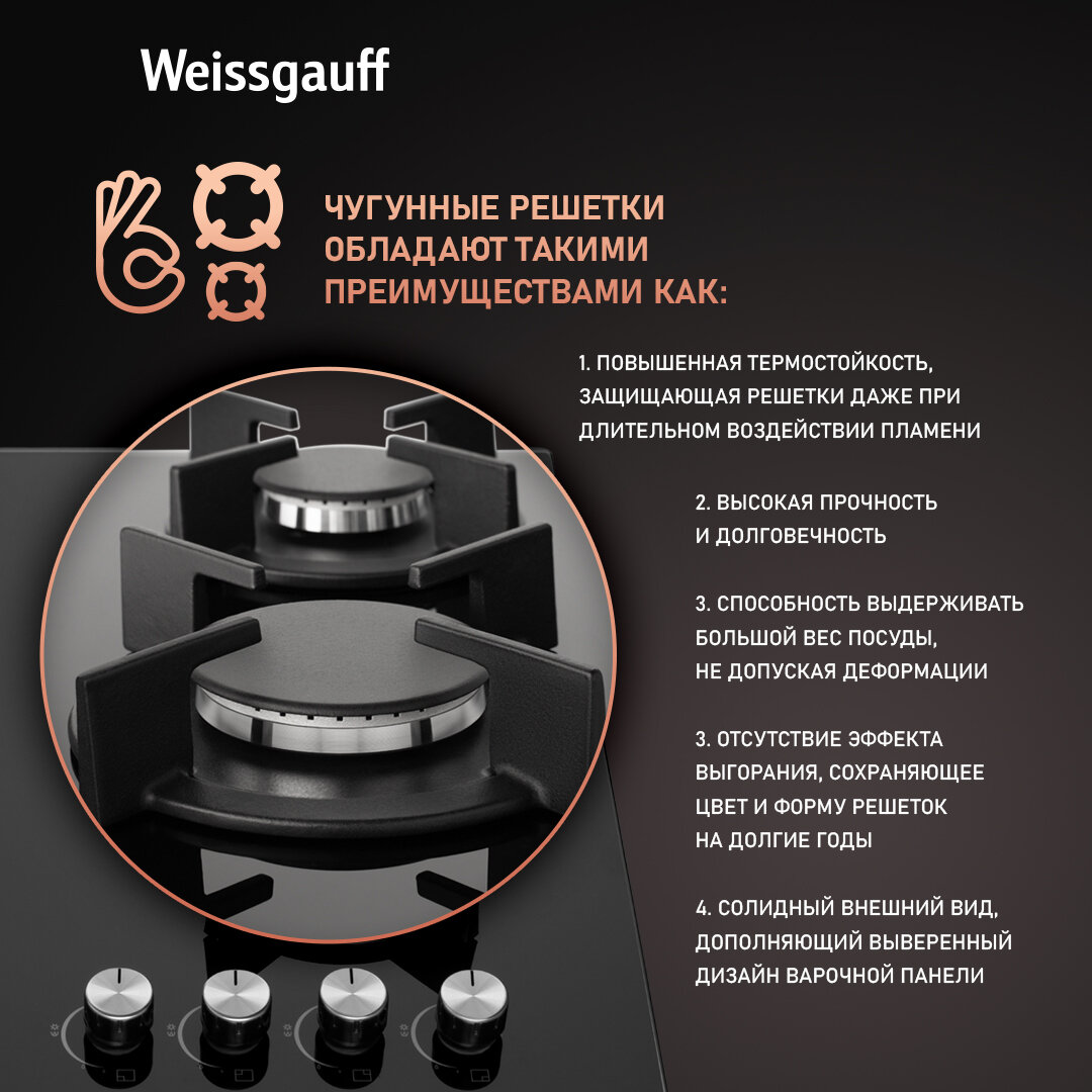 Газовая варочная панель Weissgauff HG 640 BG, закаленное стекло, черный, экспресс-конфорка