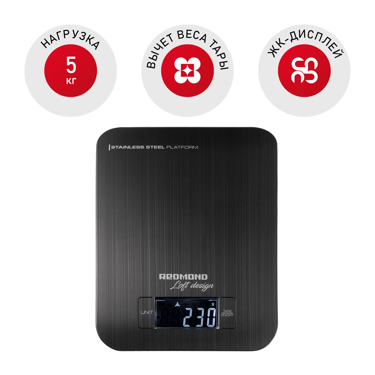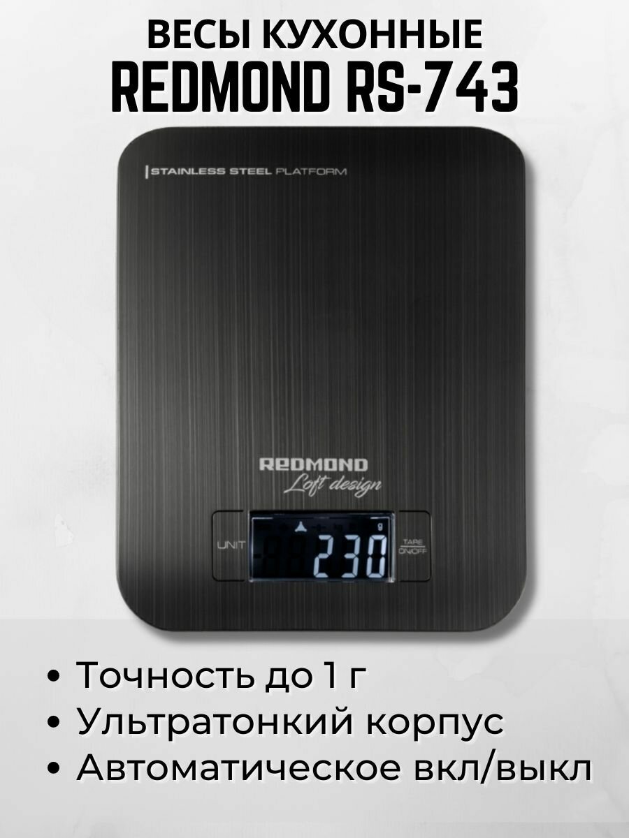 Весы кухонные REDMOND RS-743, стальная платформа, нагрузка до 5 кг, ЖК-дисплей, функция вычета тары