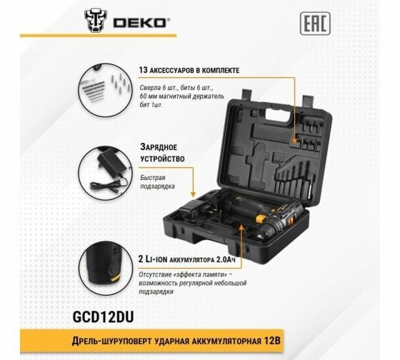 Дрель-шуруповерт ударная аккумуляторная Deko Gcd12du SET4 в кейсе + оснастка 13 шт, 12В, 2x2.0Ач