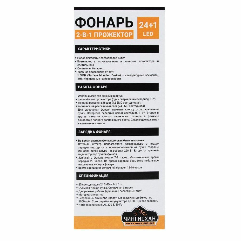 Чингисхан Фонарь прожектор 2-в-1 аккумуляторный 24 SMD + 1 Вт LED, шнур 220В, пластик, 17,5x7,5 см