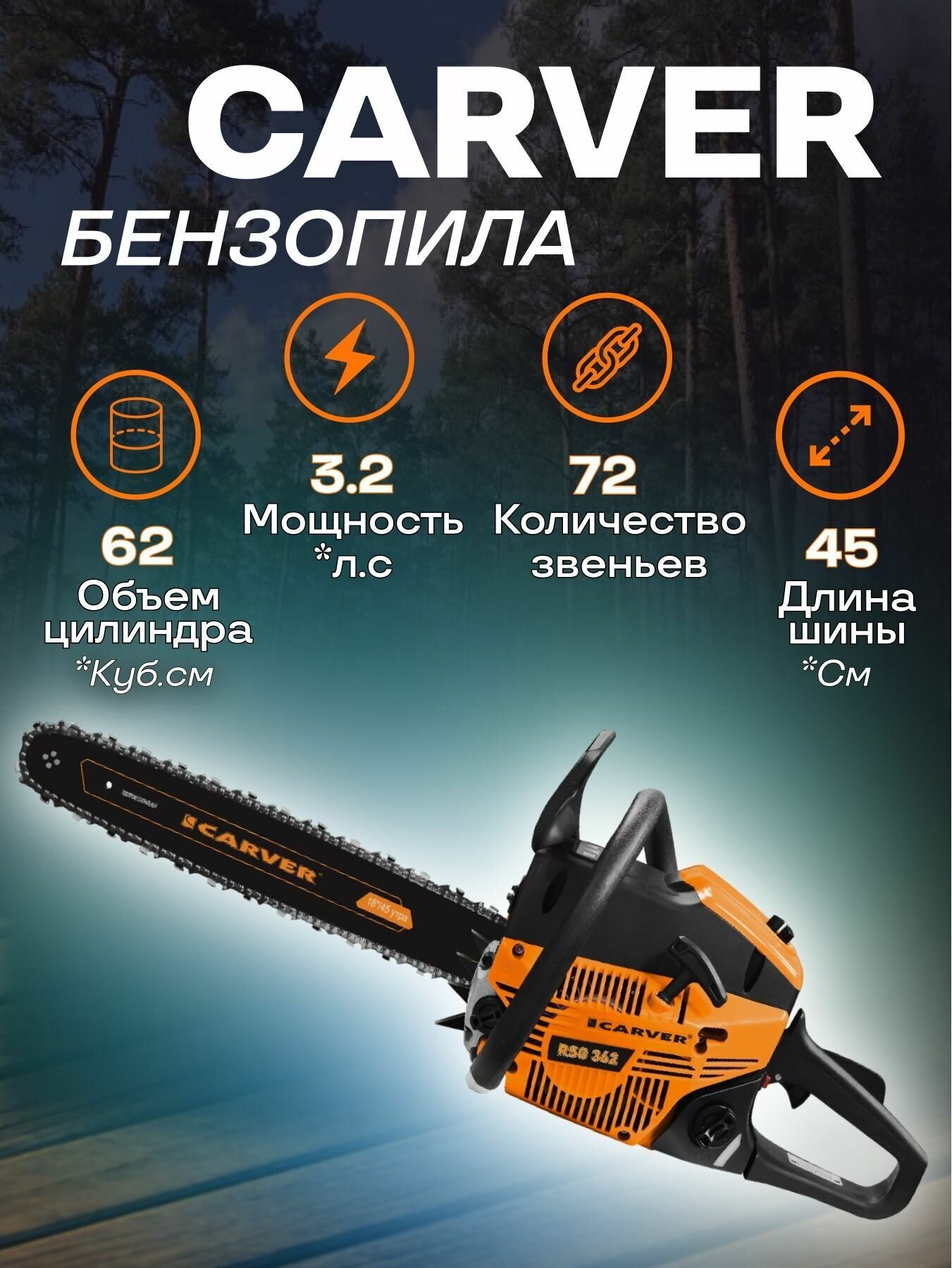 Ниже Вы можете прочитать отзывы на Бензопила CARVER RSG 362 (2,4 кВт, 3,2 л.с, 62 см.куб, шина 18"-45 см, цепь 0.325-1.5-72), ознакомится с подробными характеристиками, посмотреть интересные обзоры и фотографии на Бензопила CARVER RSG 362 (2,4 кВт, 3,2 л.с, 62 см.куб, шина 18"-45 см, цепь 0.325-1.5-72).