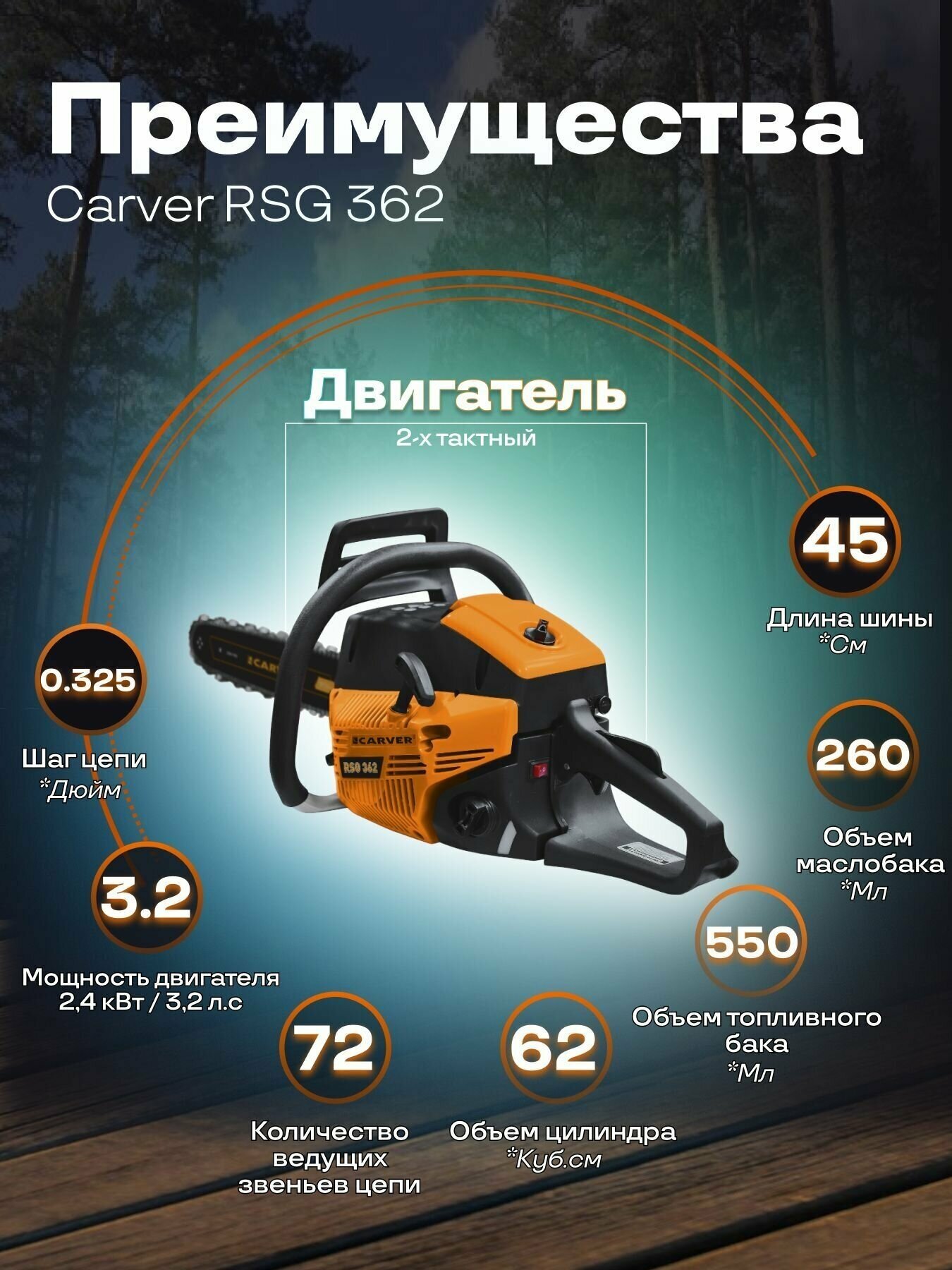 Бензопила CARVER RSG 362 (2,4 кВт, 3,2 л.с, 62 см.куб, шина 18"-45 см, цепь 0.325-1.5-72) интересное: