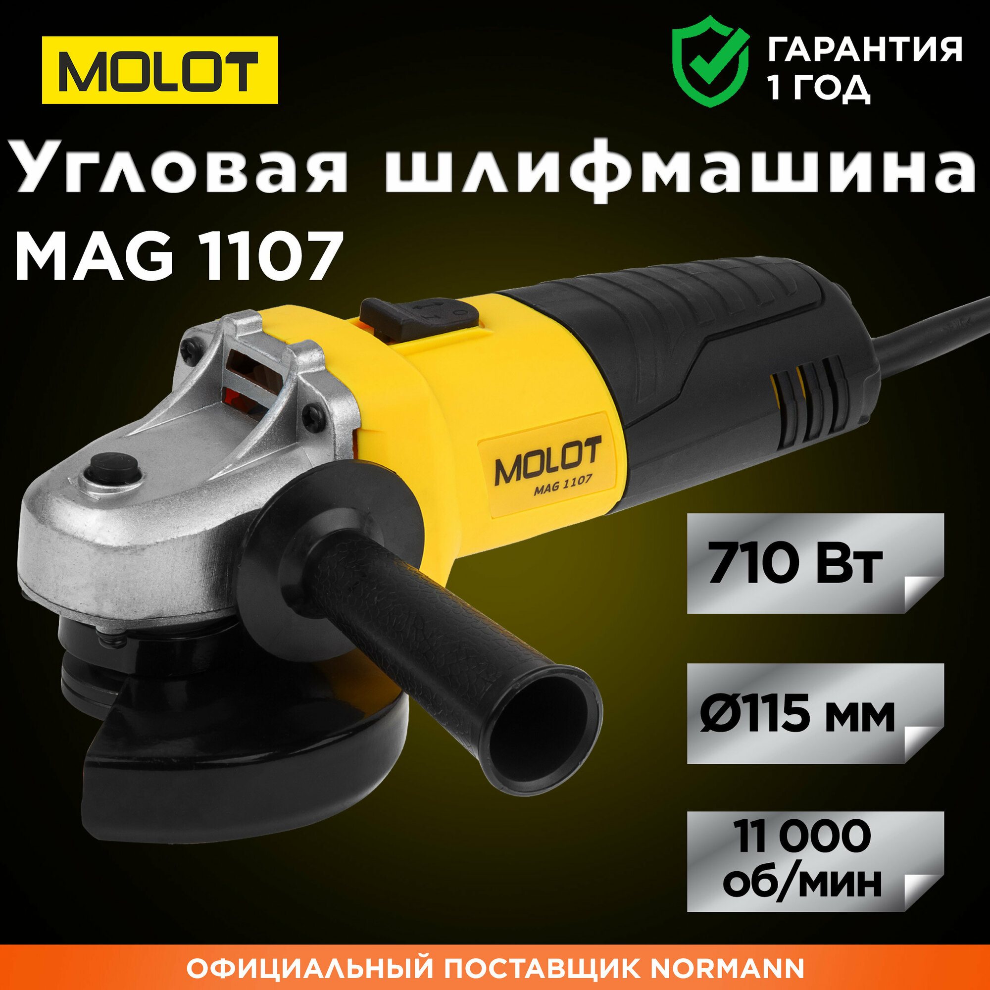 Одноручная углошлифмашина MOLOT MAG 1107 в кор. 710 Вт, 115 мм, 11000 об/мин