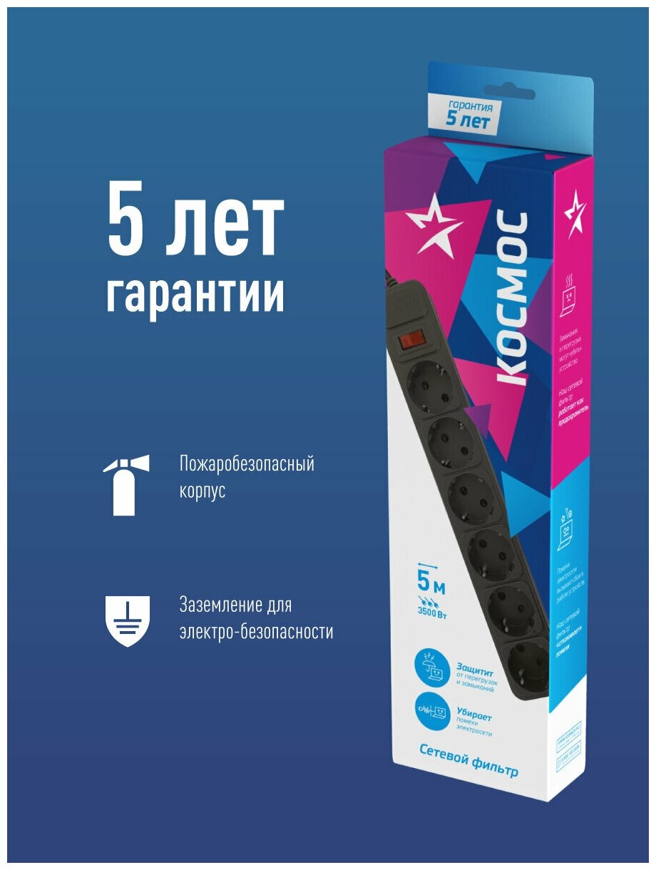 Сетевой фильтр Космос 6 розеток, 5 м, пвс 3х0,75мм2, чёрный