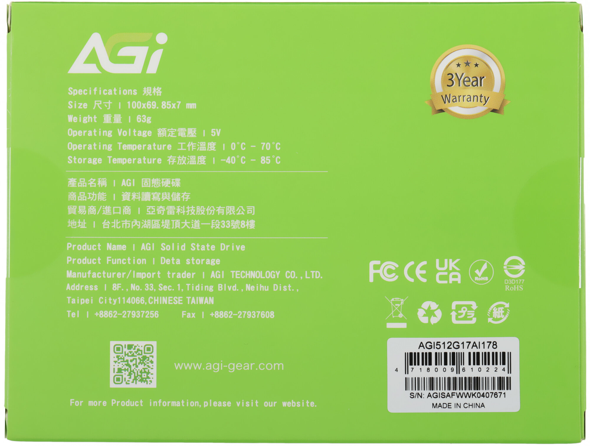 Твердотельный накопитель SSD AGI "2.5" 512GB AI178 Client SATA 6Gb/s, 538/486, IOPS 41/78K, MTBF 1.6M, 3D TLC, 300TBW," 0,54DWPD, RTL{100} (610224)