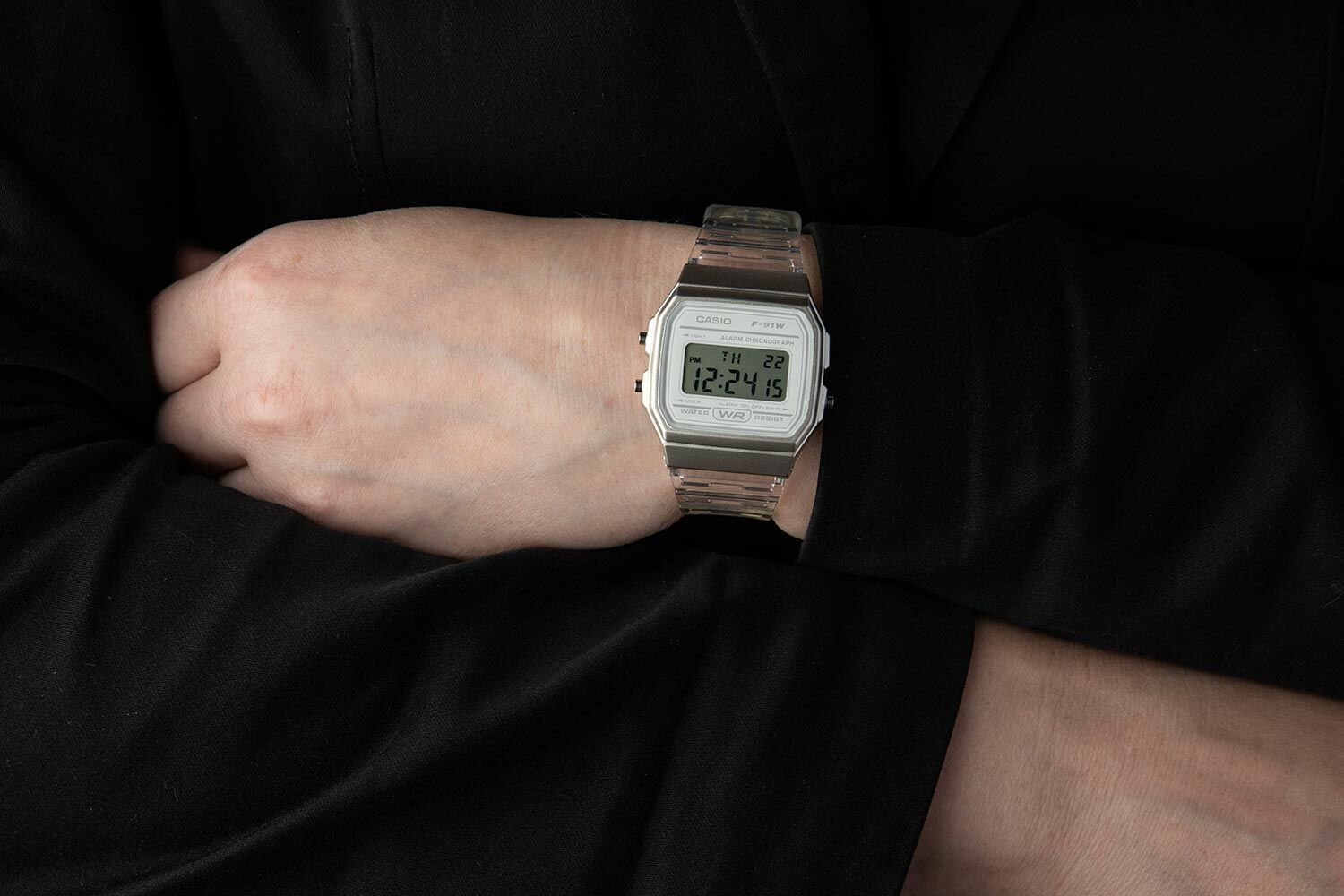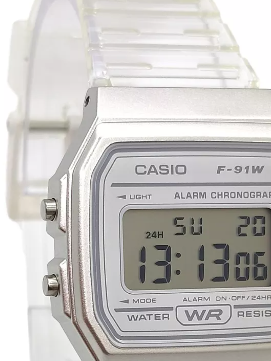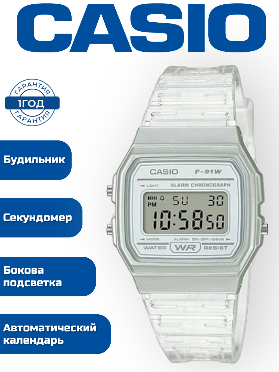 F-91WS-8E Casio наручные часы кварцевые WR30 (3 атм) мужские, женские серый, бесцветный секундомер будильник отображение числа, отображение дня недели подсветка дисплея акриловое стекло