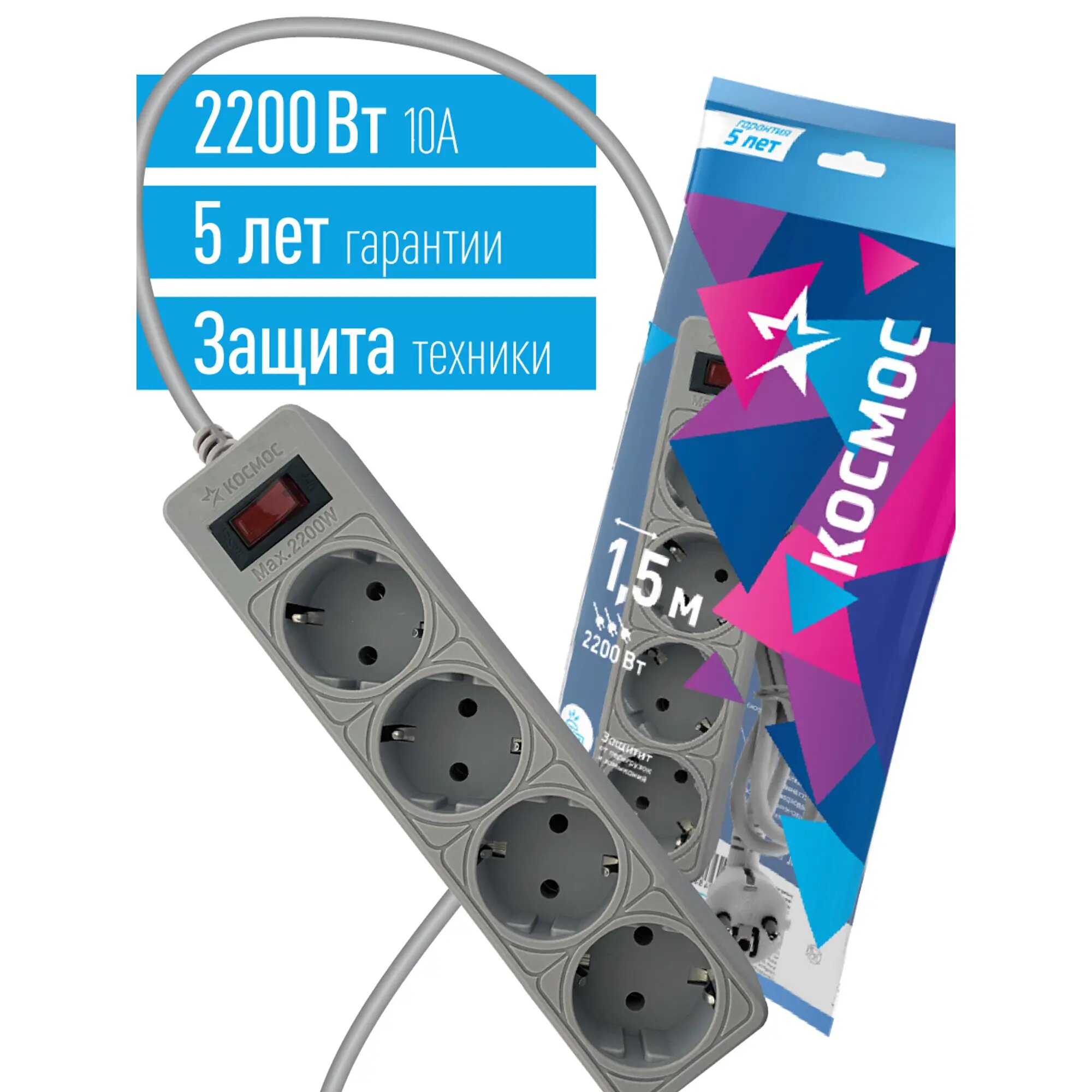 Сетевой фильтр Космос 4 розетки, 1,5 м, пвс 3х0,75мм2, серый