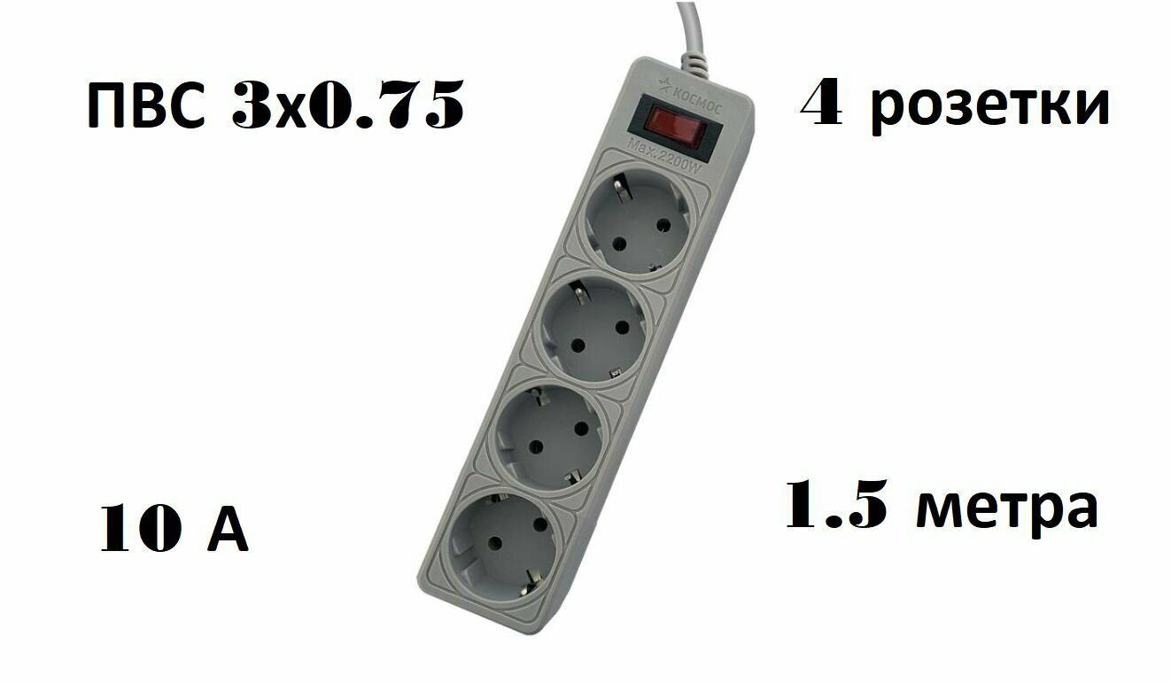 Сетевой фильтр Космос Электро Космос 4х1.5м с заземл. 10А IP20 2.2кВт с пред. 3х0.75 индик. сети, серый, FKsm1.5m-4g(G)