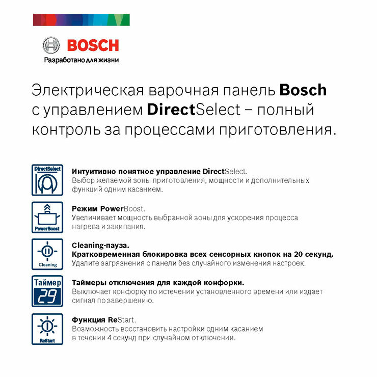 | Дополнительная информация | Интуитивное понятное управление DirectSelect, индикация остаточного тепла, главный выключатель, дисплей индикации энергопотребления |