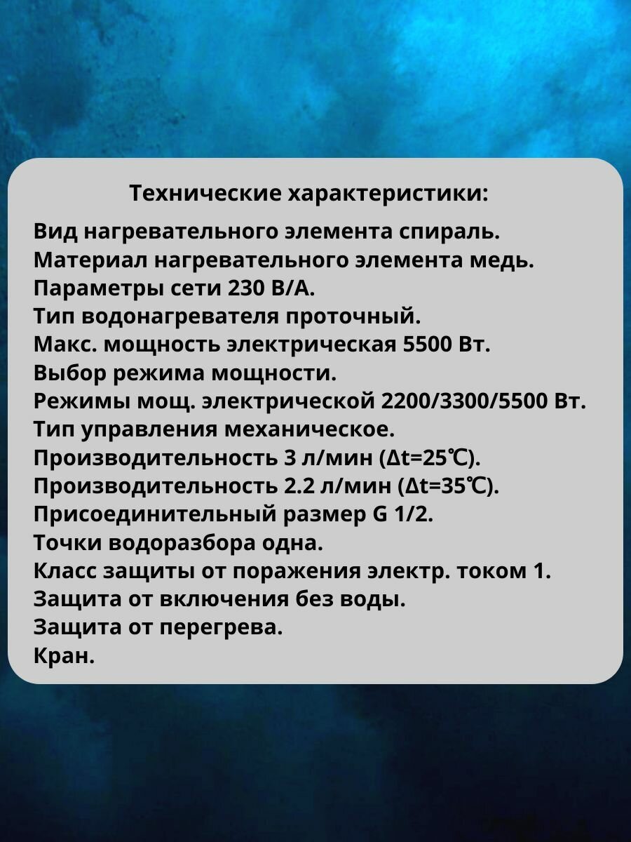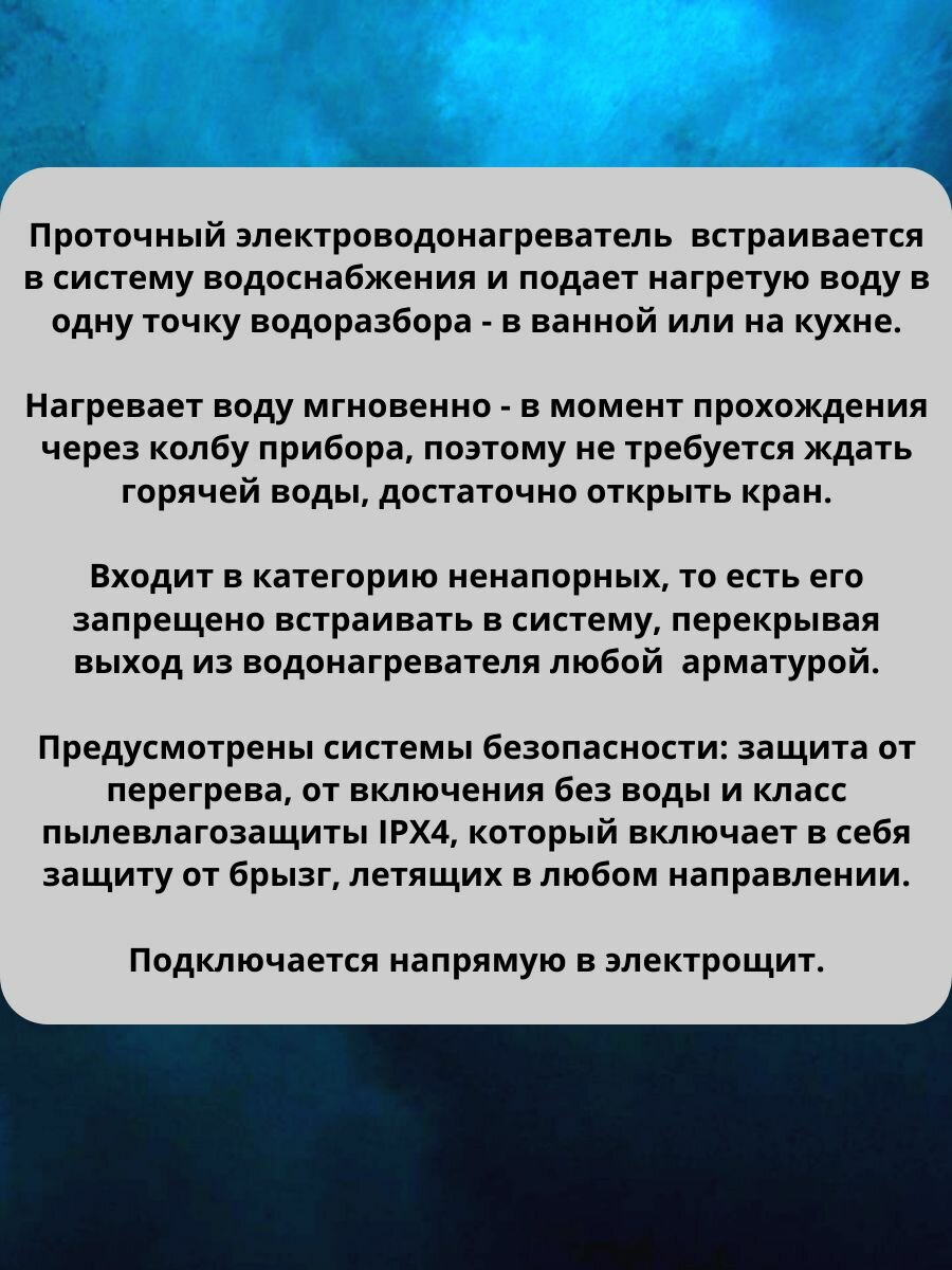 | Тип водонагревателя | проточный |