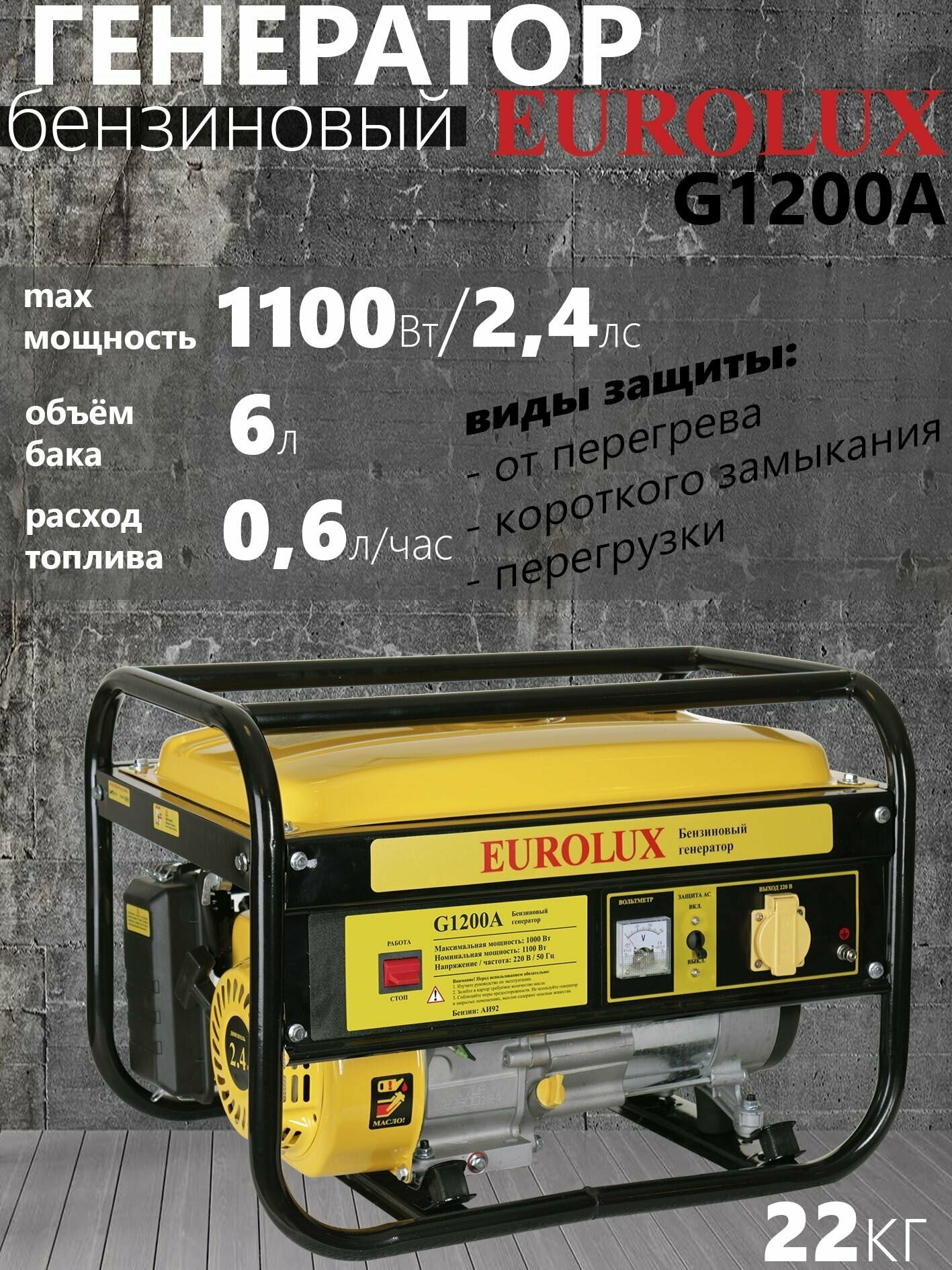 Генератор EUROLUX G1200A 2.4лс 1.1кВт бензин 220в 6л интересное: